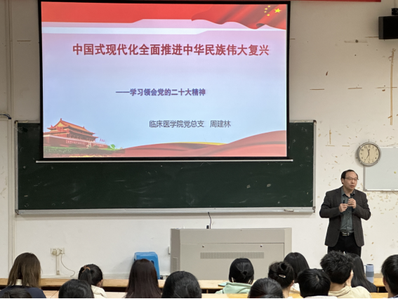 为深入学习贯彻习近平新时代中国特色社会主义思想,引导新时代青年在党和国家事业发展大局中找准方位、立志成为堪当民族复兴重任的新时代好青年,11月16日晚临床医学院党总支周建林书记为我院2023级学生讲授《中国式现代化全面推进中华民族伟大复兴》主题党课。