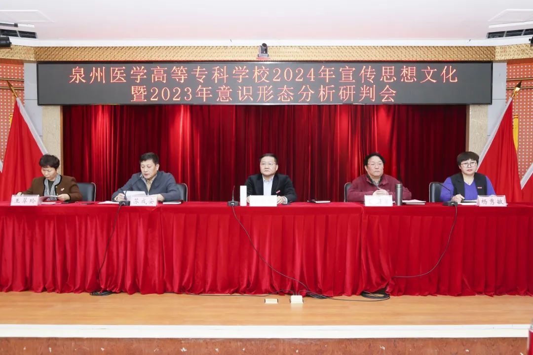 为深入学习习近平新时代中国特色社会主义思想和习近平总书记对宣传思想文化工作的重要指示批示精神和党的二十大精神,推动学校宣传思想文化工作实践创新,推动学校思想政治工作提质增效,2024年1月5日,泉州医学高等专科学校召开2024年宣传思想文化暨2023年意识形态分析研判会,总结2023年学校宣传思想文化工作,部署2024年宣传思想文化工作,并对2023年意识形态工作进行分析研判。校领导,各行政部门负责人,院部党总支书记、分管学生工作副院长,全体辅导员参加会议,校党委委员、副校长苏成安主持会议。