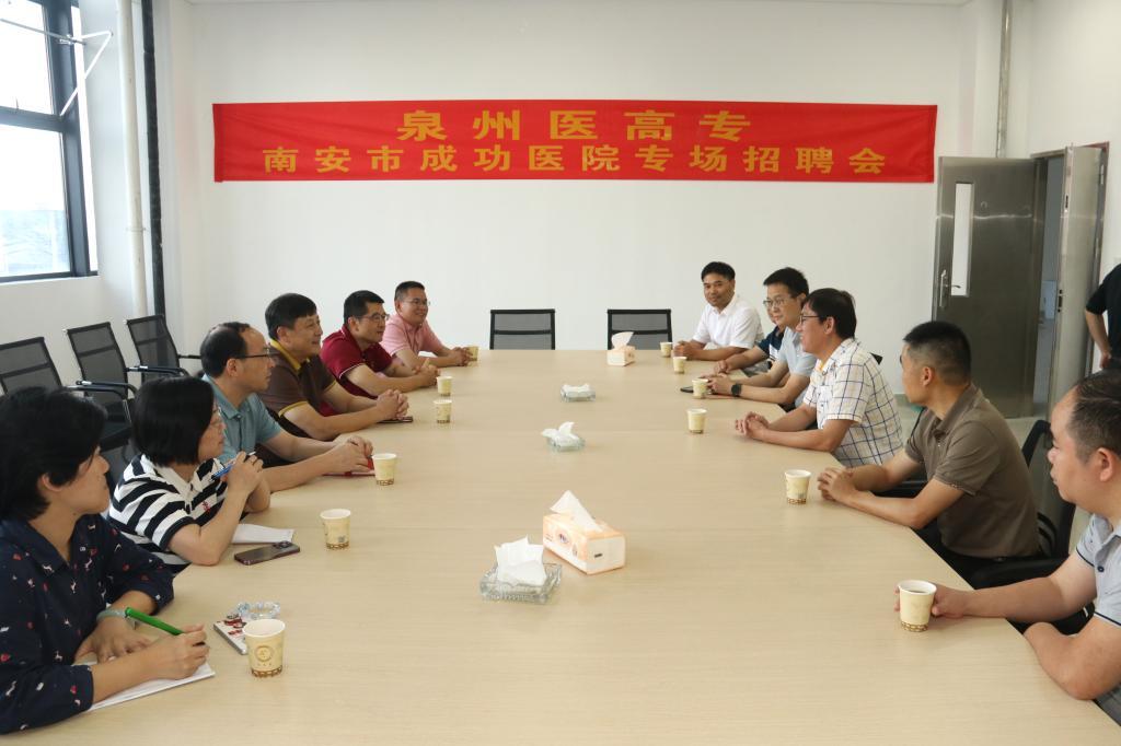 座谈会上,副校长苏成安主要介绍了学校的发展计划以及今年毕业生的就业状况和就业需求。石井镇党委书记廖徐伟介绍了南安市石井镇地理位置的优越性以及南安市的医疗需求,南安市成功医院书记李金国就南安市成功医院目的员工规模、发展规划、岗位需求展开介绍。双方就如何更好地促进校企合作、留住人才进行深入探讨。