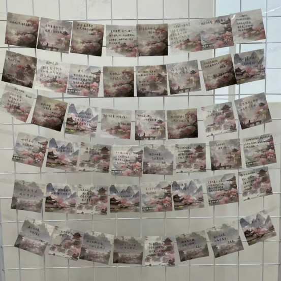 活动中,主持人通过PPT与视频介绍了端午节的起源与习俗,重点讲解了香囊的文化寓意。同学们随后书写端午诗词,重温古人情怀,并亲手体验香囊制作——从裁剪布料、填充香料到细心缝制,大家在协作中创作出各具特色的香囊。