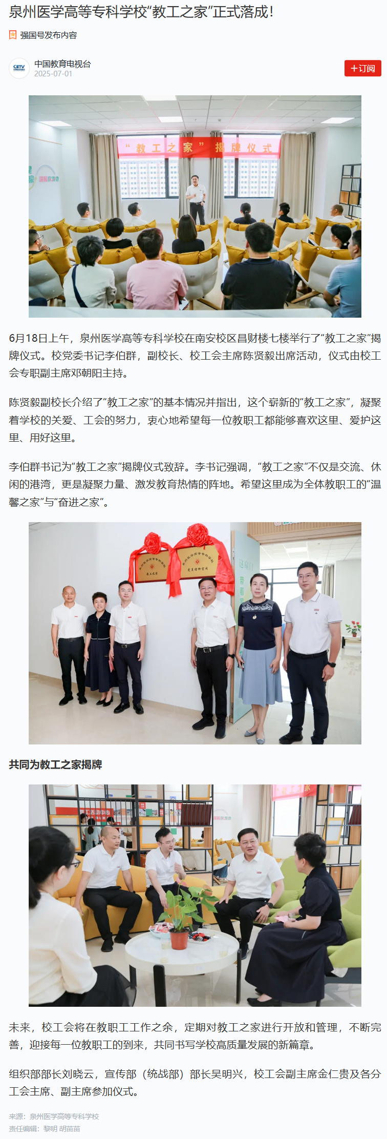中国高校之窗/中国教育网络电视台/中国教育电视台(强国号)/中国教育电视台(人民号):泉州医学高等专科学校“教工之家”正式落成!