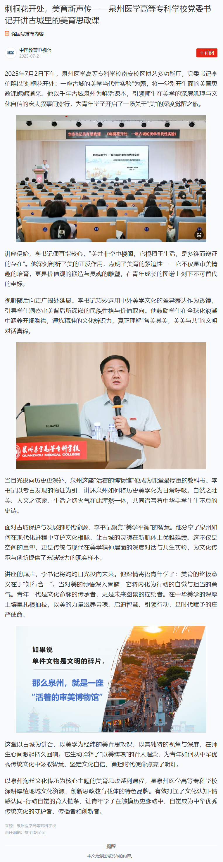 中国高校之窗/中国教育网络电视台/中国教育电视台(强国号)/中国教育电视台(人民号):刺桐花开处,美育新声传——泉州医学高等专科学校党委书记开讲古城里的美育思政课