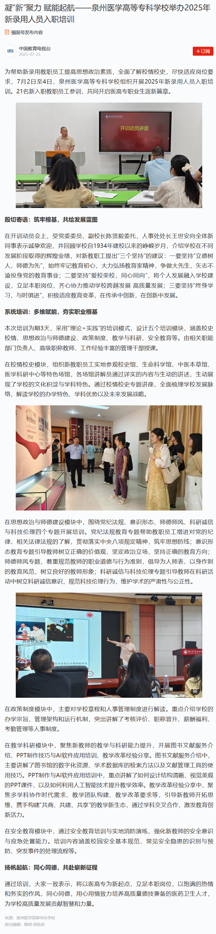 中国高校之窗/中国教育网络电视台/中国教育电视台(强国号):凝“新”聚力 赋能起航——泉州医学高等专科学校举办2025年新录用人员入职培训