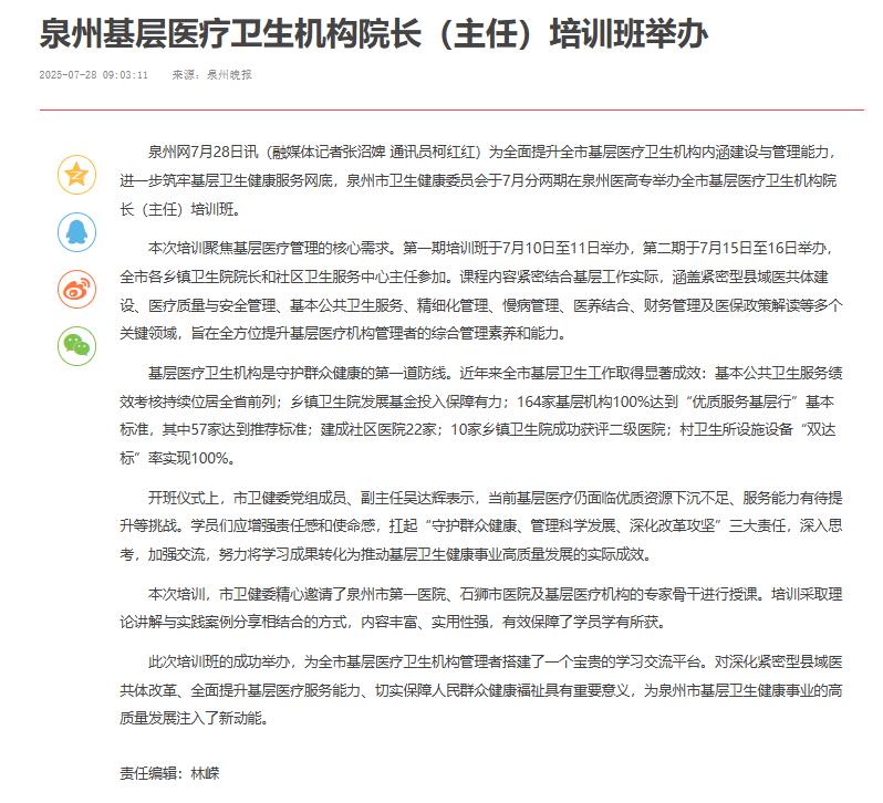 泉州网:泉州基层医疗卫生机构院长(主任)培训班举办