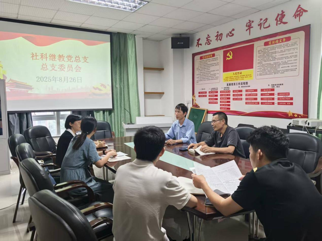 2025年8月26日,社科继教党总支在洛江校区图书信息中心七楼小会议室召开总支委员会议,会议由社科继教党总支书记曾树东同志主持,全体党总支委员参会。