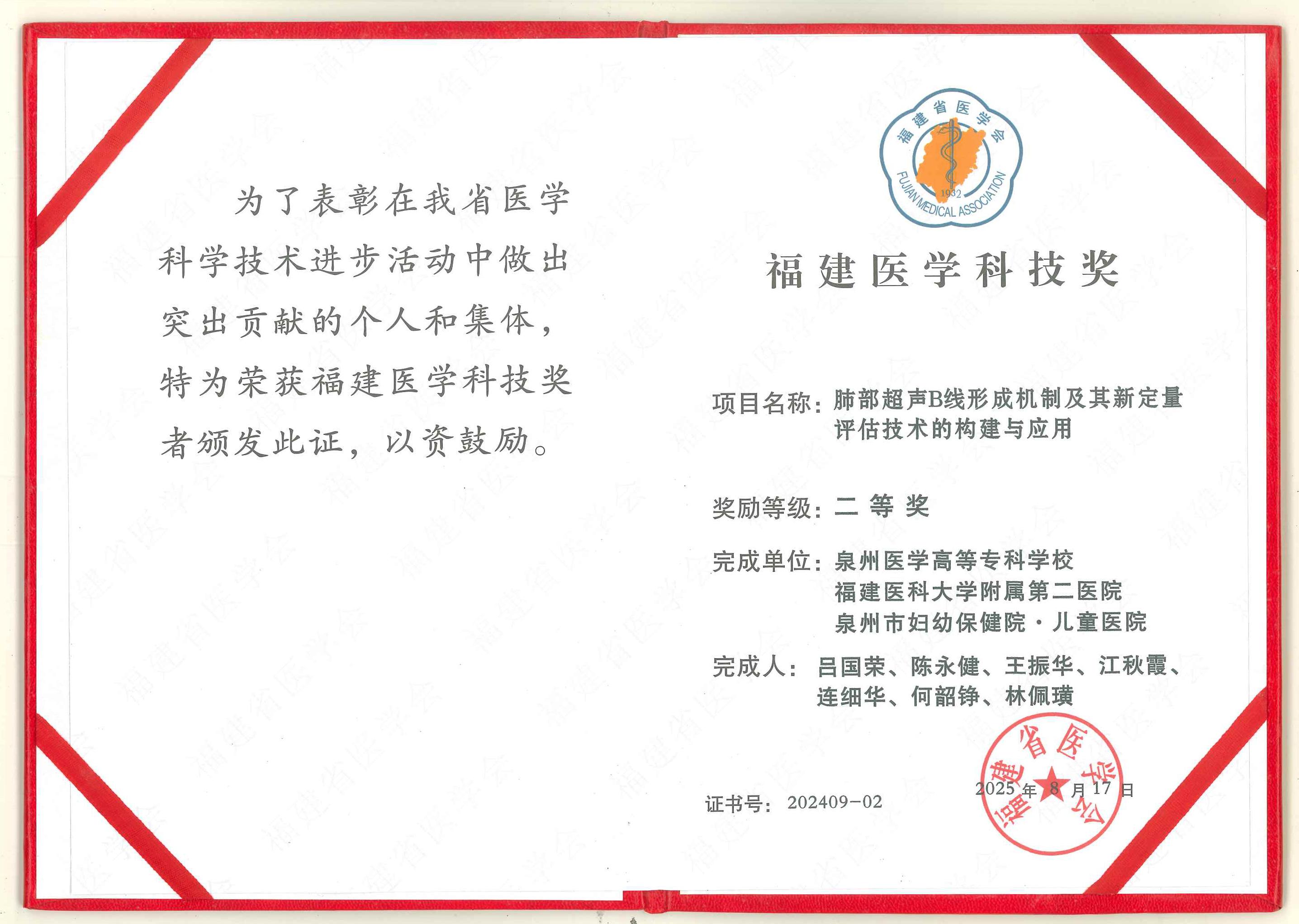 近日,福建省医学会正式公布2024年度福建医学科技奖获奖名单。由我校吕国荣教授主持的《肺部超声B线形成机制及其新定量评估技术的构建与应用》项目荣获二等奖。