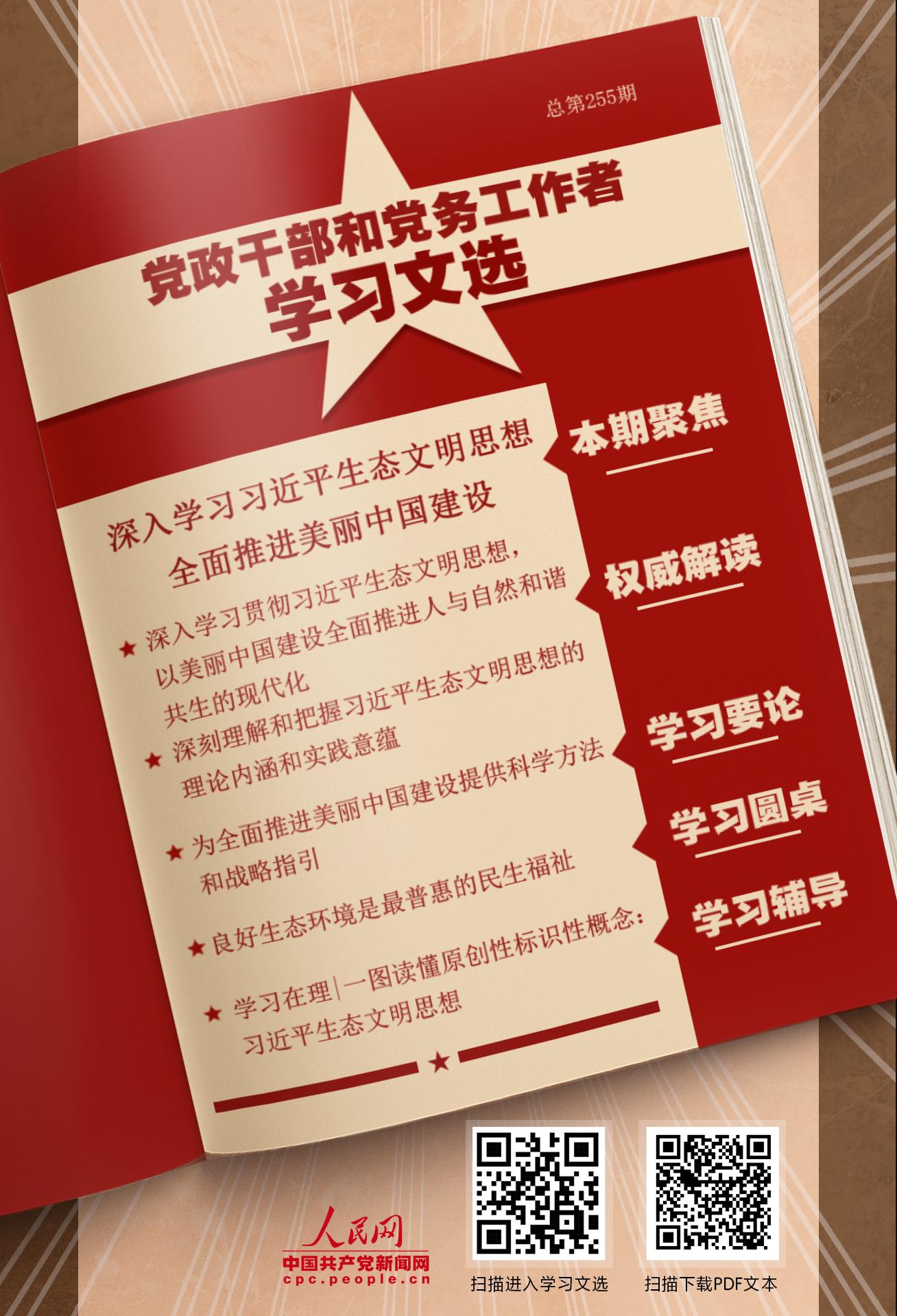 摘要: 生态文明建设功在当代、利在千秋。党的十八大以来,以习近平同志为核心的党中央把生态文明建设作为关系中华民族永续发展的根本大计,全面加强生态文明建设,提出一系列新理念新思想新战略,形成了习近平生态文明思想。前不久出版的《文选》,收入习近平总书记关于生态文明建设的重要文稿79篇,系统反映了习近平生态文明思想的丰富内涵、科学体系和原创性贡献。认真学习这部重要著作,对于深入学习贯彻习近平生态文明思想,以美丽中国建设全面推进人与自然和谐共生的现代化,具有重要意义。【详细】