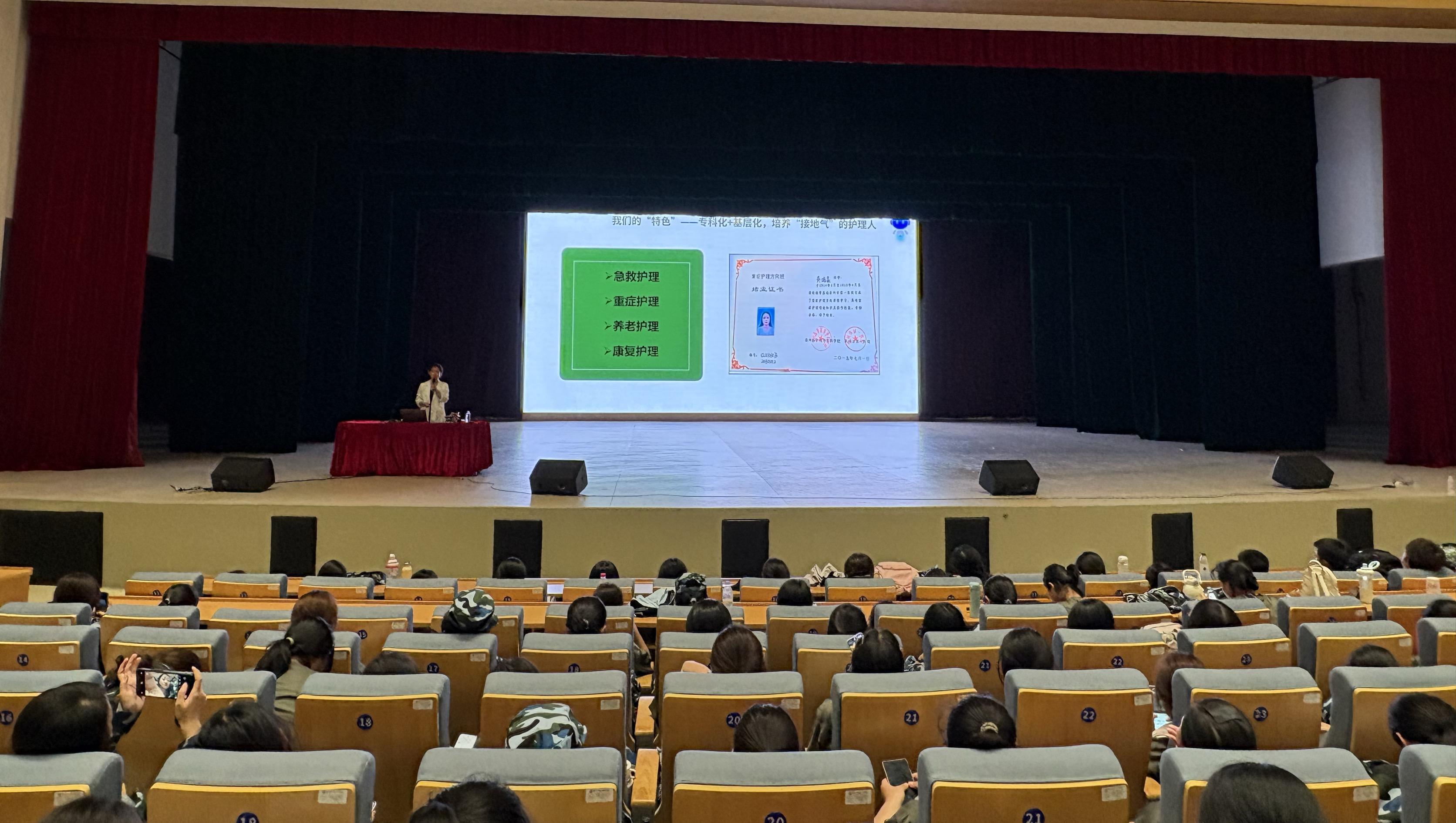 讲座中,彭金副院长首先以校史为切入点,回顾了学校自1934年惠世高级护士学校创办以来的发展历程,通过讲述早期校友扎根山区、服务群众的感人事迹,深刻阐释了“精诚惠世”的校训精神。随后,彭金副院长对学院基本情况进行简单介绍。我校是福建省高职高专护理专业规模最大院校之一,目前护理专业在校生近2000人,师资力量雄厚,“双师型”教师占比高;实训基地按“仿真医院”标准建设,并依托本地实际需求开设特色课程,与多家医院合作共建教学班,着力培养学生解决临床实际问题的能力。在讲座的最后,彭金副院长与在场的大一新生分享多位优秀校友的成长案例,并寄语新生要常怀“敬畏之心”,尊重生命、恪守职责;秉持“深耕之心”,精进专业、锤炼技能;永葆“热爱之心”,不忘初心、服务病患。