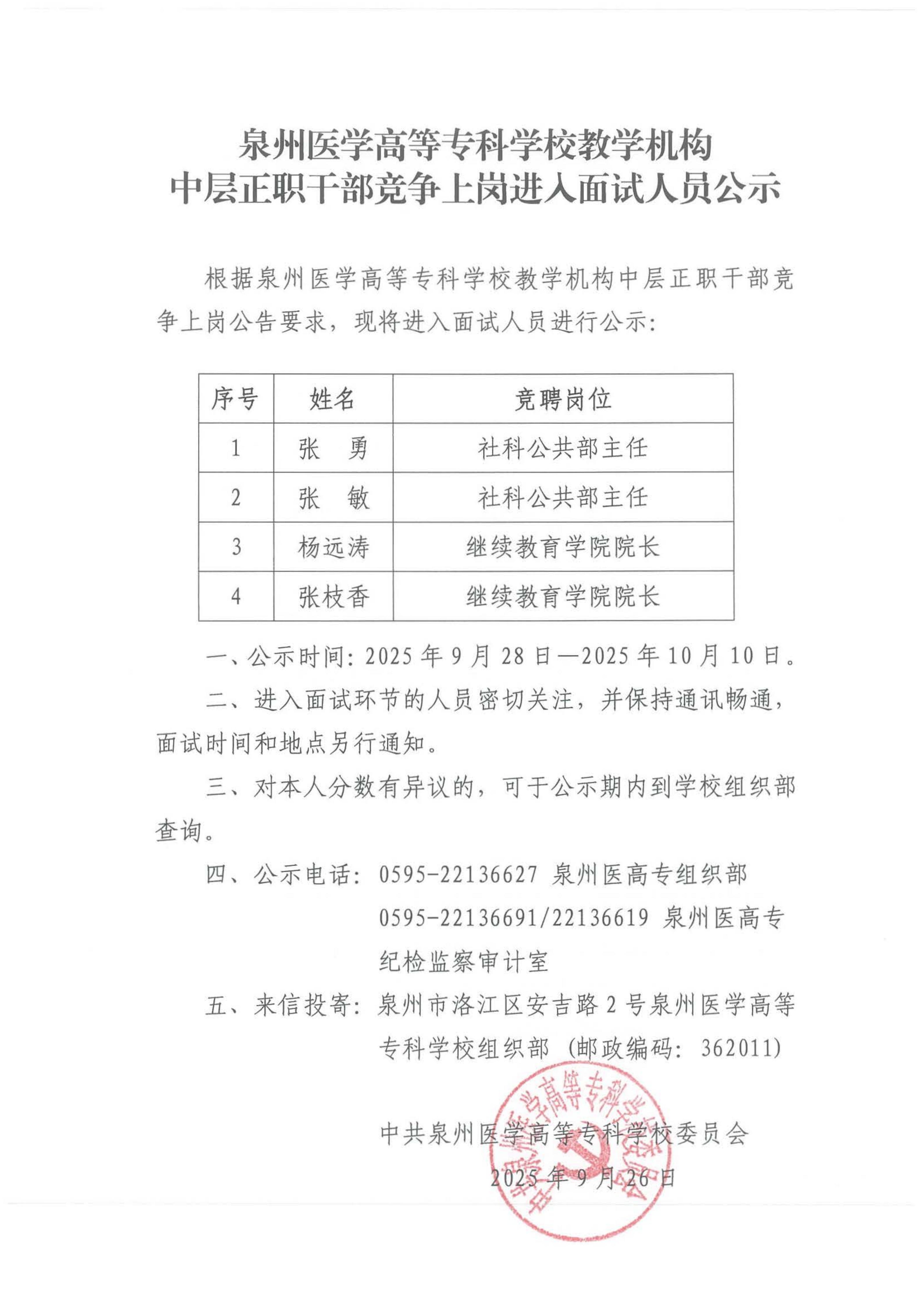 泉州医学高等专科学校教学机构中层正职干部竞争上岗进入面试人员公示
