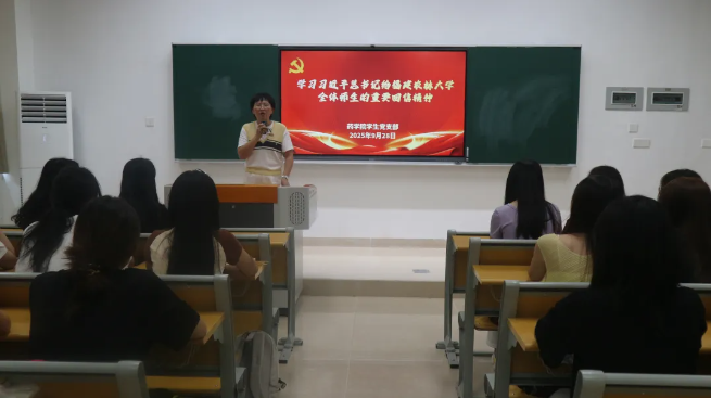 9月28日,药学院学生党支部组织入党积极分子在南安校区济世楼102教室学习习近平总书记给福建农林大学全体师生的重要回信精神。药学院副院长、党总支纪检委员、学生党支部书记黄桂茹,党支部宣传委员兼纪检委员郑亚彬以及第43期全体入党积极分子参加会议。