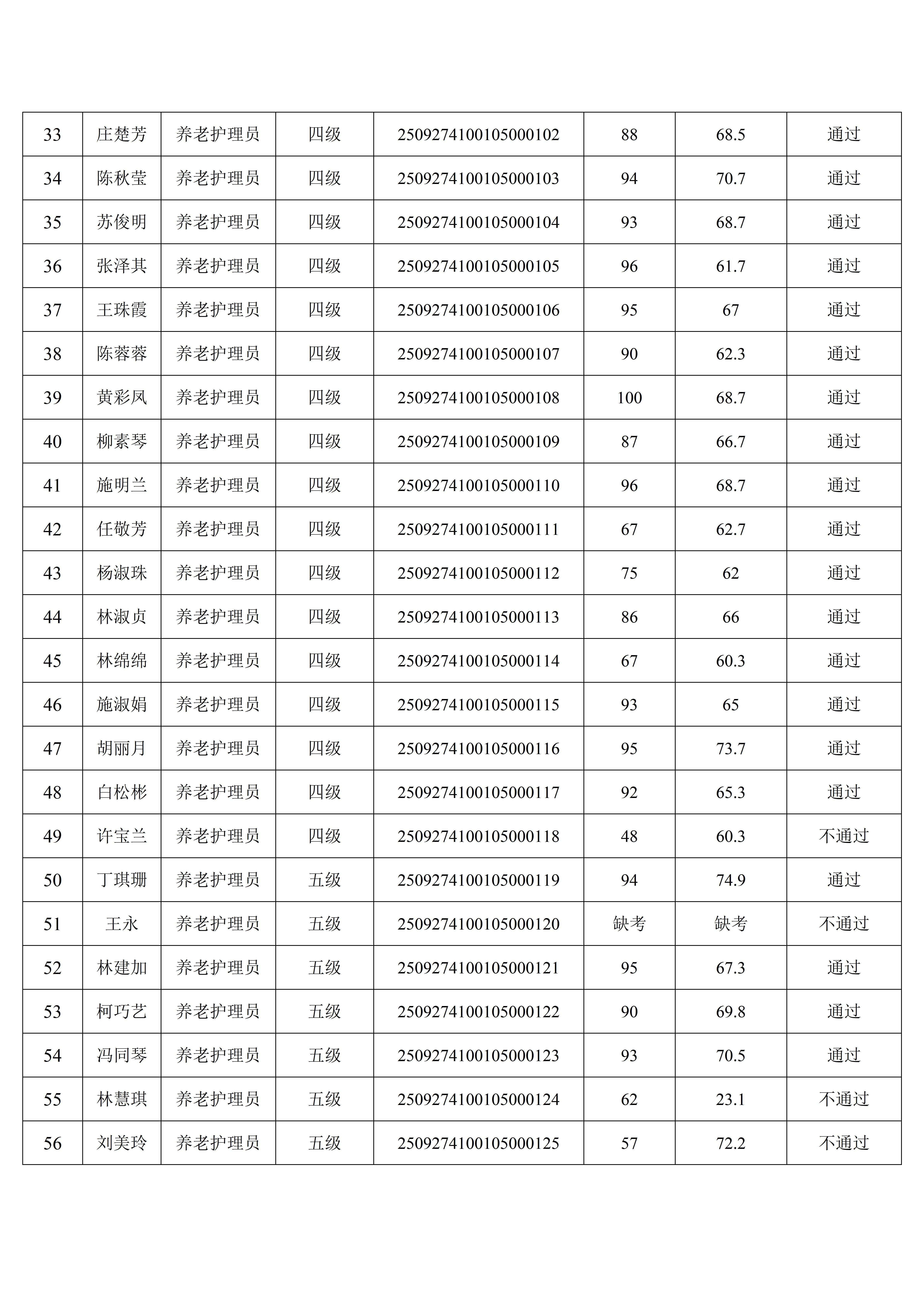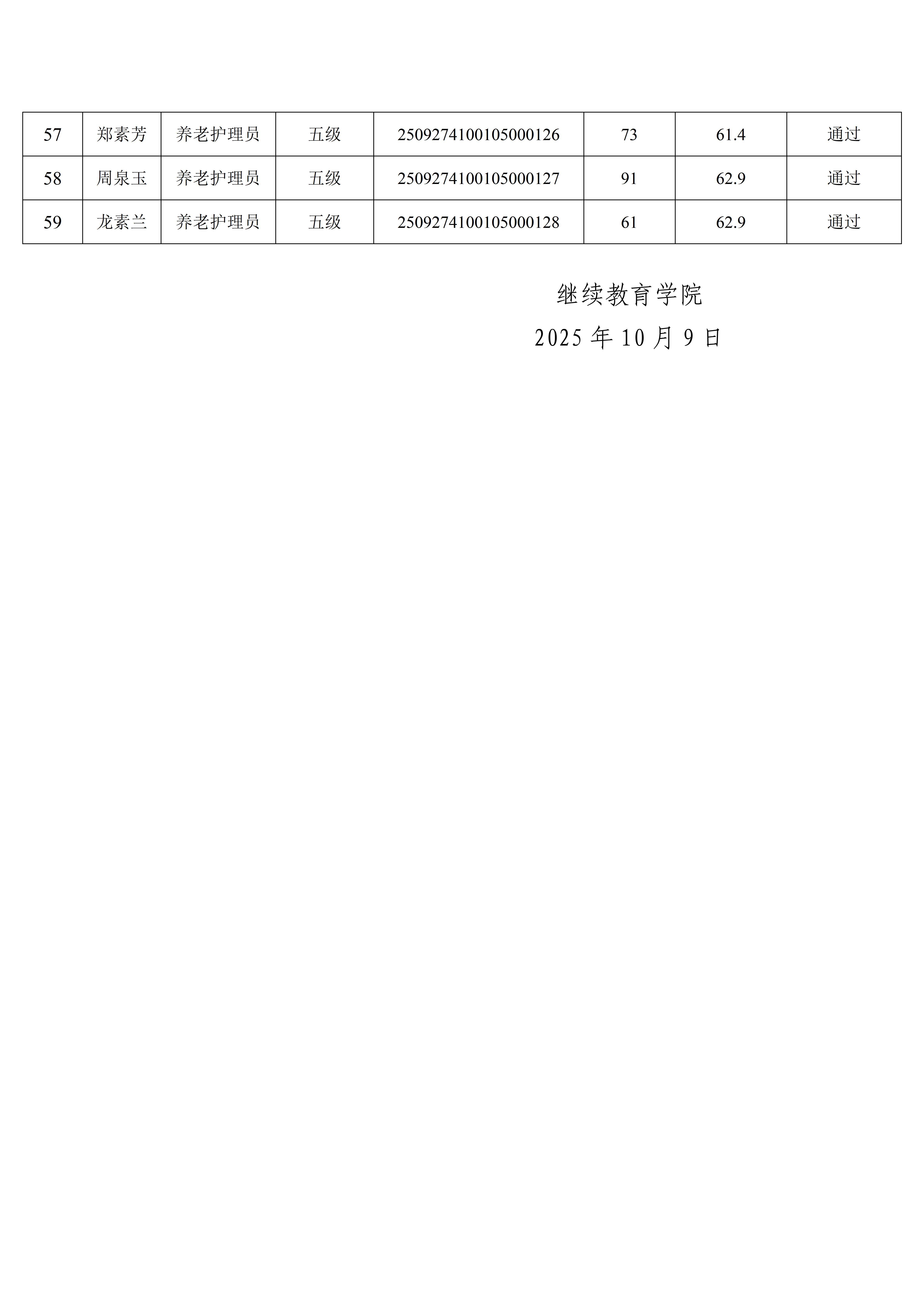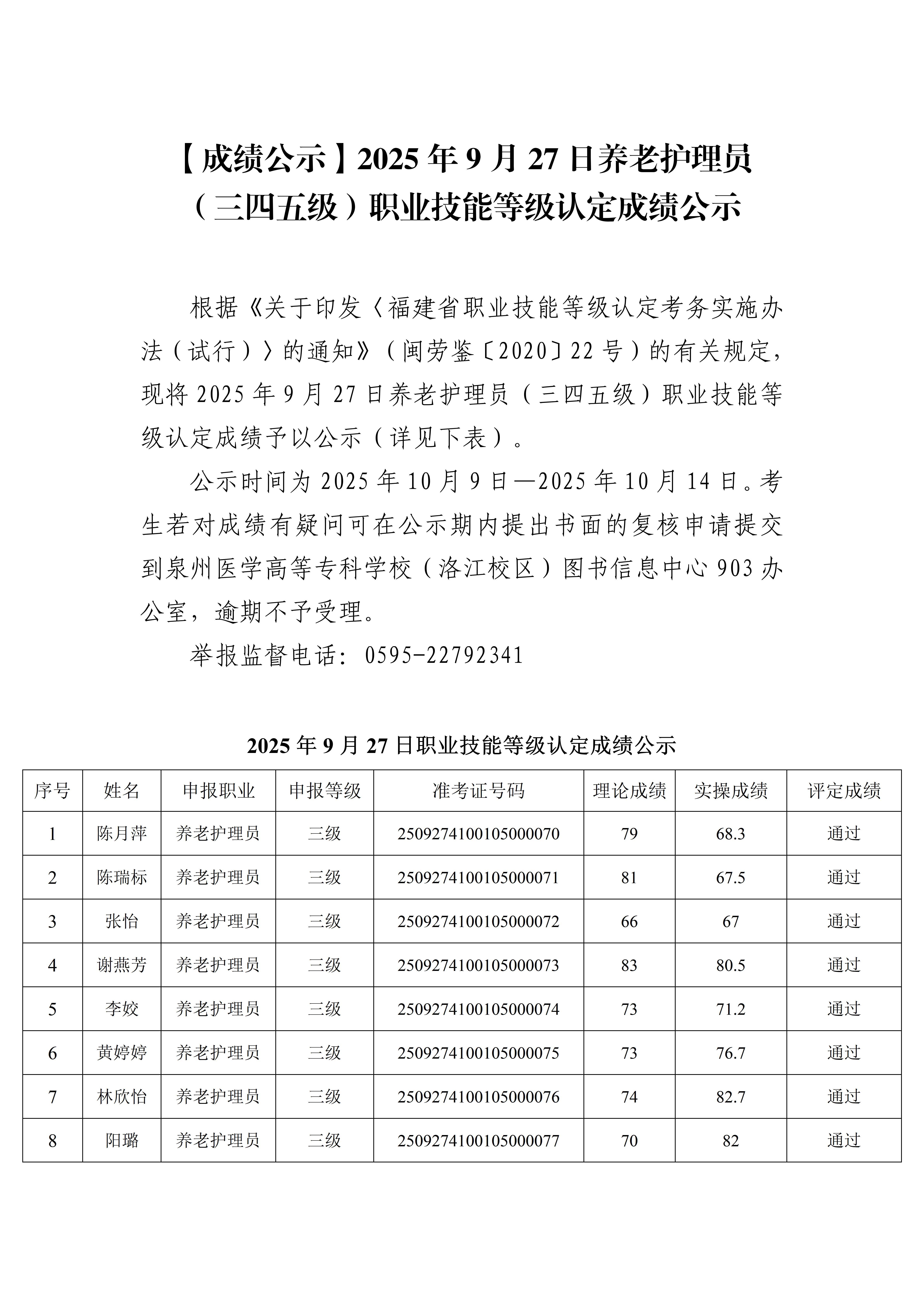 【成绩公示】2025年9月27日养老护理员(三四五级)职业技能等级认定成绩公示