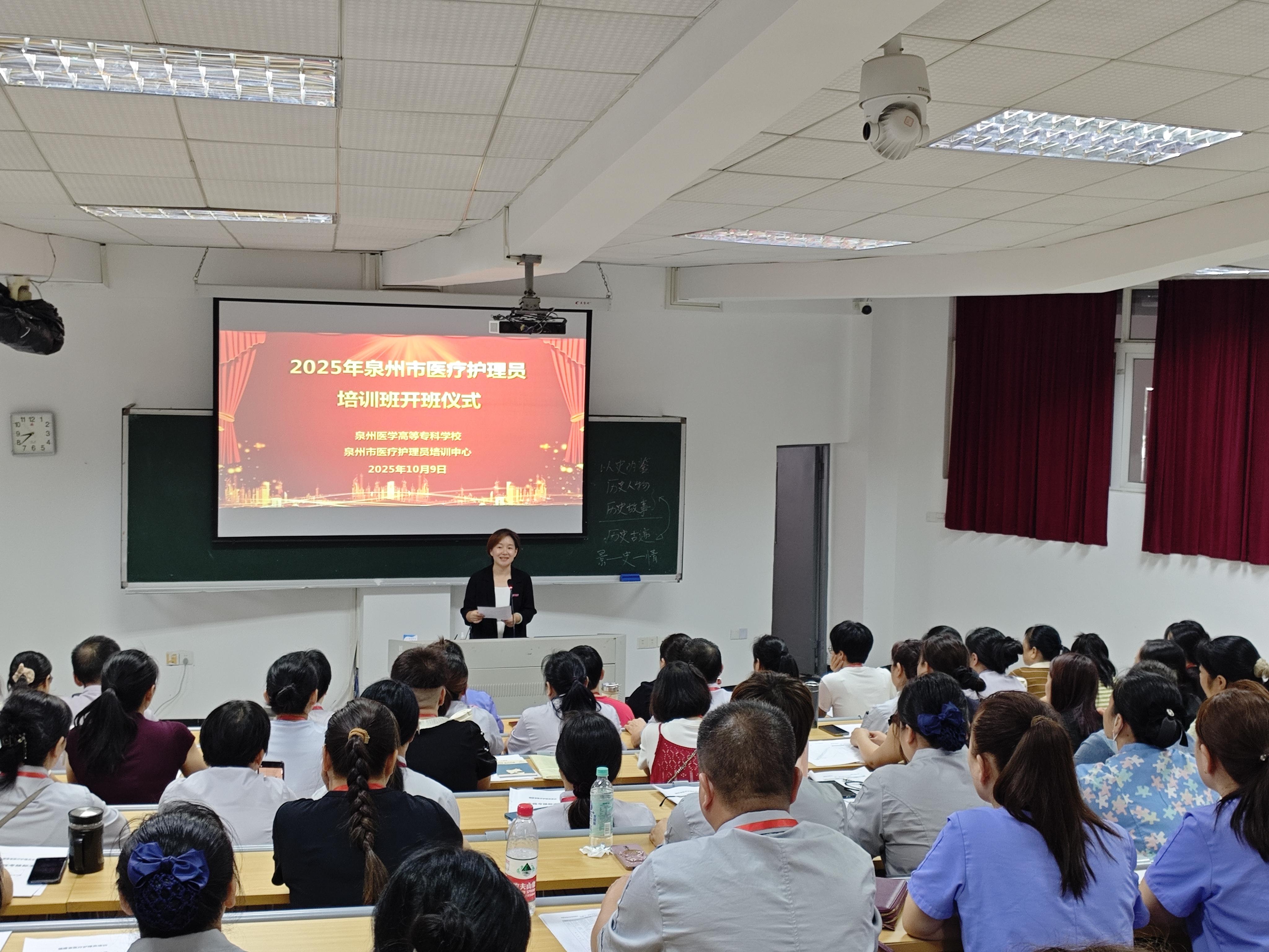2025年10月9日上午,泉州医高专省级医疗护理员培训开班仪式在学校顺利举行。护理学院彭金副院长(主持工作)出席仪式并讲话,继续教育学院副院长吴春燕应邀出席,来自全市25家单位125名参训学员及培训授课教师代表共同参加开班仪式。