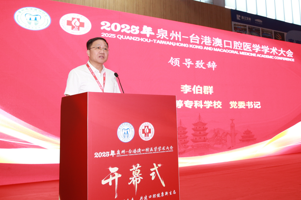 校党委书记李伯群为大会致开幕词,他表示泉州医学高等专科学校是福建省唯一一所医学类国家示范性建设骨干高职院校,口腔医学专业作为学校重点特色专业,承担着为区域输送优秀口腔医疗人才、探索口腔领域产学研融合的重要职责。此次联合办会,旨在搭建高水平交流平台,让泉州与台港澳同仁们携手,为“口腔健康新生态”贡献力量。