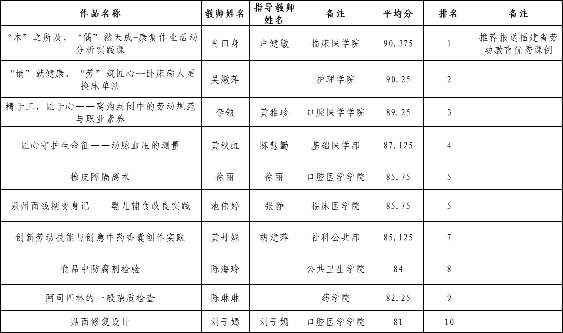 关于2025年泉州医学高等专科学校劳动教育优秀课例评审结果的公示