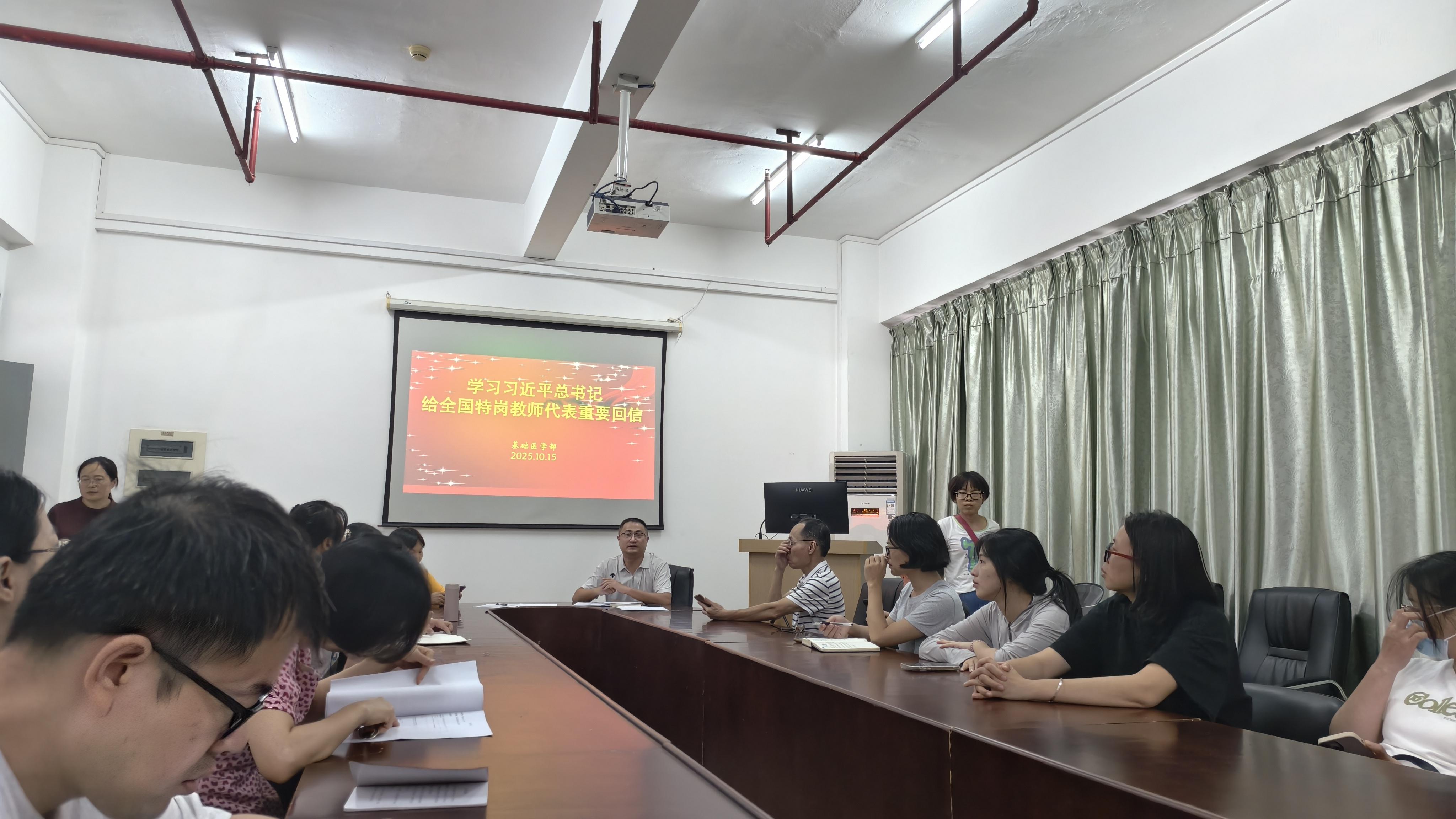 10月15日下午,基础医学部组织全体教师开展“学习习近平总书记给全国特岗教师代表回信”专题会议。会议集中学习了回信全文,重点领会总书记对广大教师和教育工作者“积极投身乡村教育事业,扎根三尺讲台,潜心耕耘、默默奉献,展现了人民教师的情怀和担当”的殷切期望。会议强调,全体教师要以回信精神为指引,厚植教育情怀,强化育人责任,在医学人才培养中践行“健康所系、性命相托”的医者初心。