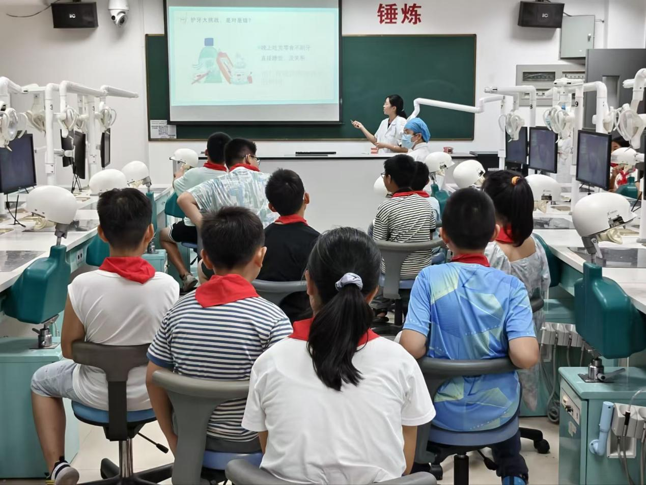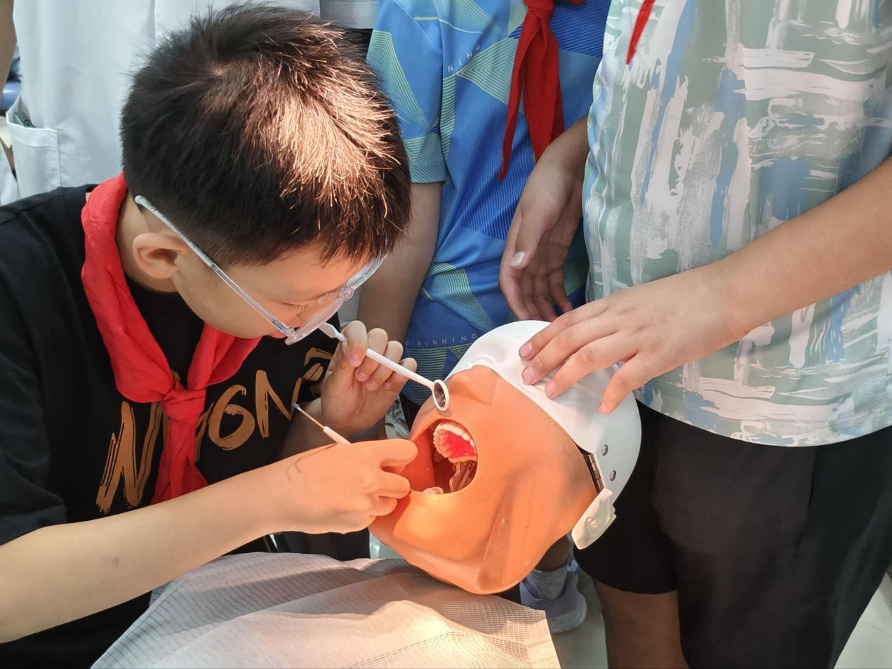 在“小牙医体验”环节中,实验小学的学生们一个个化身“小小牙医”,在专业教师指导下学习口腔检查工具使用、正确刷牙方法,沉浸式体验口腔健康守护的重要性。