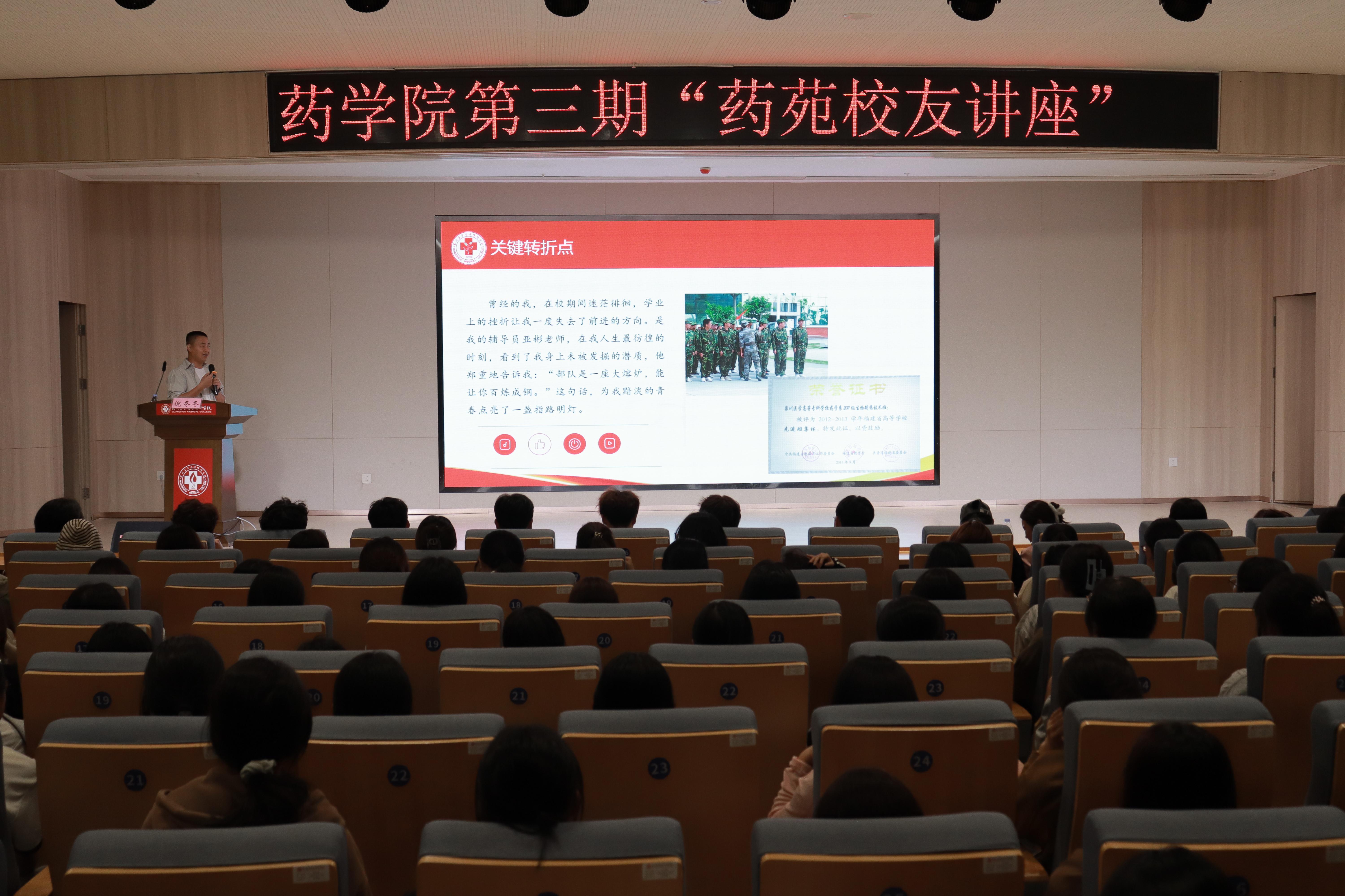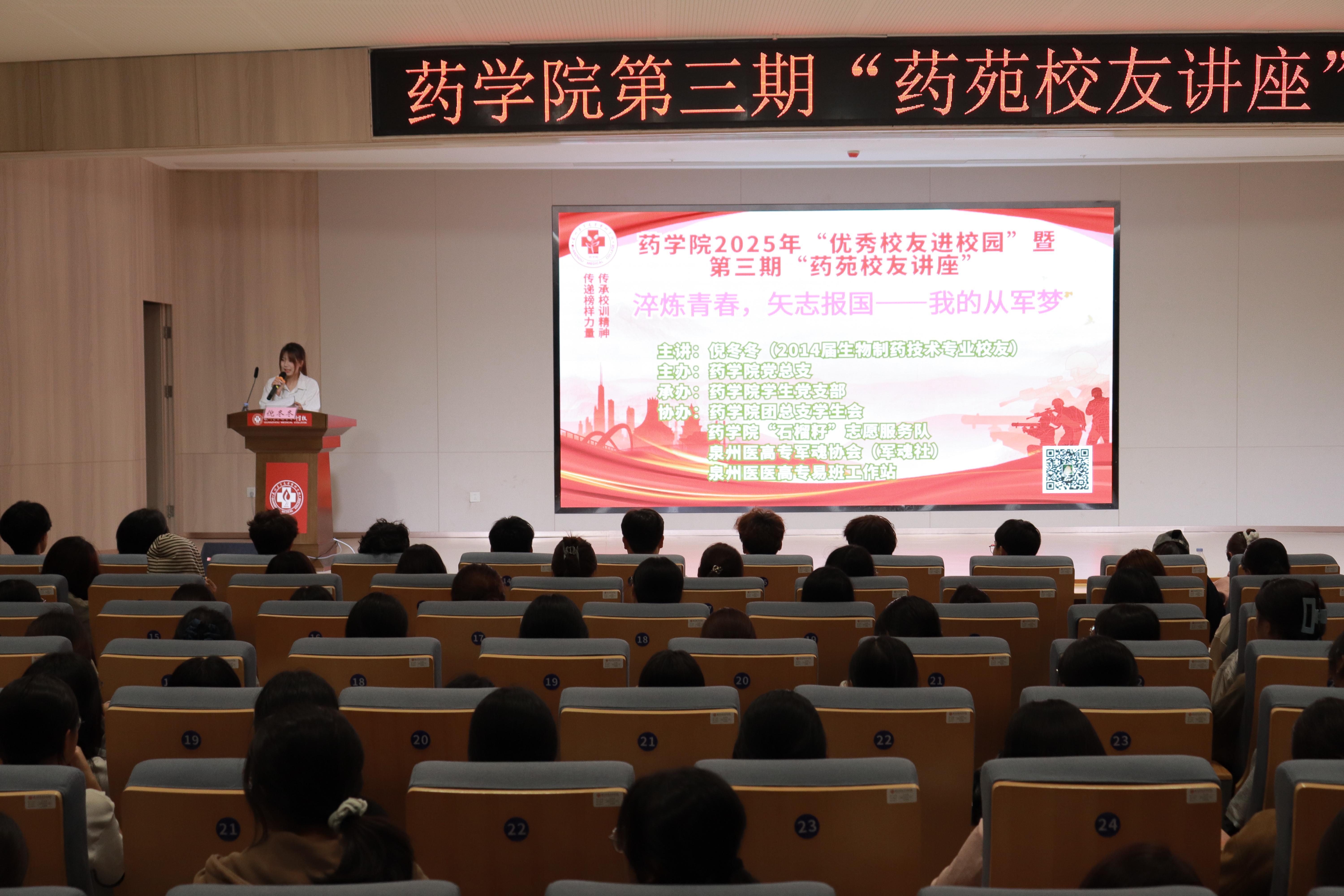2025年10月21日晚,药学院在南安校区博艺文体中心二楼多功能厅举办2025年“优秀校友进校园”暨第三期“药苑校友讲座”。本次讲座由药学院党总支主办,药学院学生党支部承办,药学院团总支学生会、药学院“石榴籽”志愿服务队、泉州医高专军魂协会(军魂社)、泉州医高专易班工作站协办。讲座邀请我校2014届生物制药技术专业优秀校友倪冬冬担任主讲,2024级中药学1班廖雪薇同学担任主持人。药学院学生党支部组织委员张莉莉老师、宣传委员郑亚彬老师,以及200余名2024级、2025级学生代表参加了本次活动。