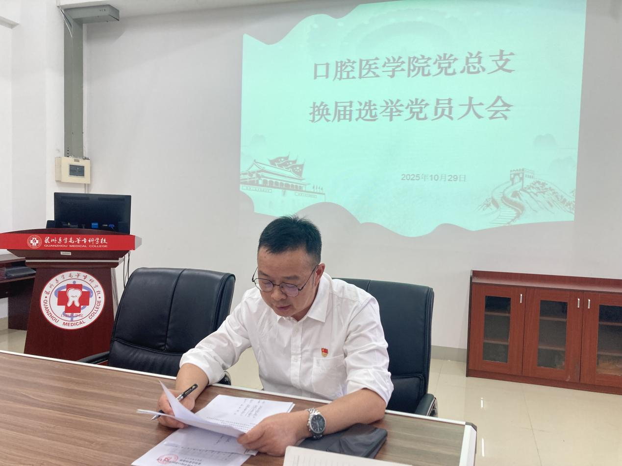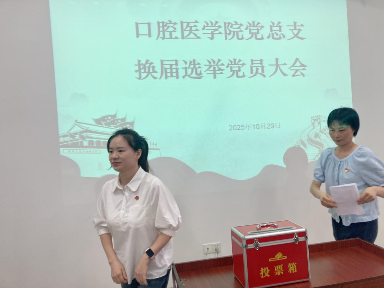为进一步加强学院党组织建设,2025年10月29日下午,口腔医学院党总支严格按照《中国共产党章程》《中国共产党基层组织选举工作条例》和《中国共产党普通高等学校基层组织工作条例》召开换届选举大会。校党委组织部长刘晓云出席会议,学院党总支书记吕红军主持,学院全体党员参会。