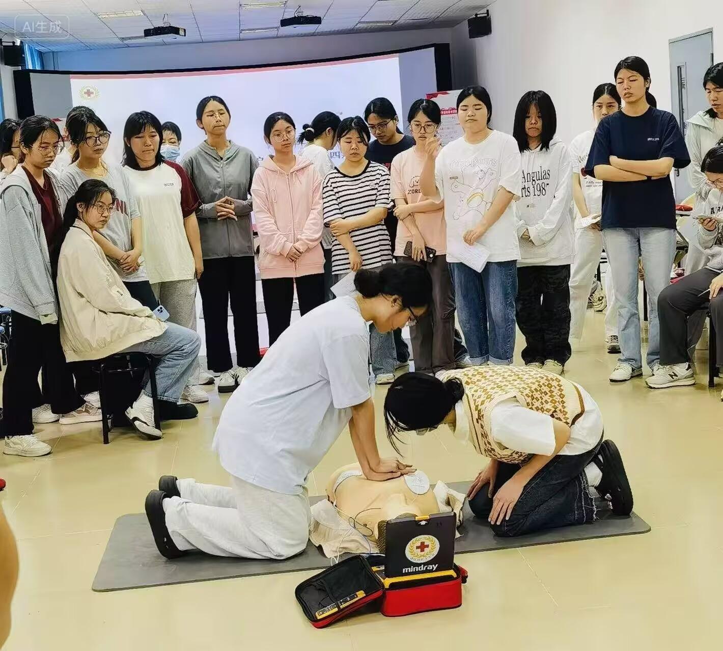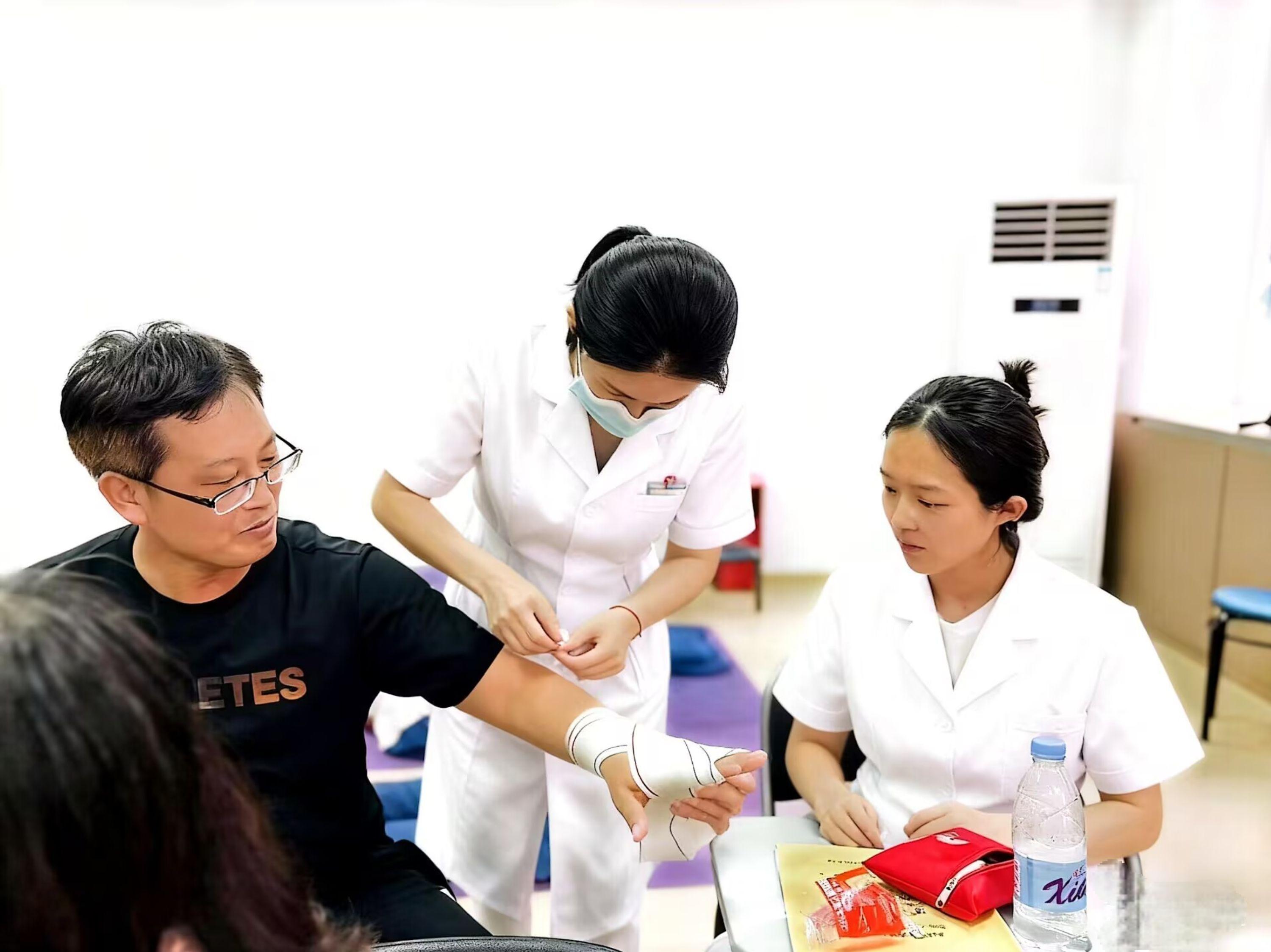 本次定向赛设置了三大核心赛项,精心布置在附属楼的不同楼层点位,各代表队需根据地图指引,依次前往各个赛项完成挑战。海姆立克急救法赛点,参赛队员需迅速判断“患者”状况,并从背后实施标准的海姆立克腹部冲击,动作精准、有力,争分夺秒地疏通气道梗阻;心肺复苏赛点,在模拟人面前,队员们跪地操作,判断意识、胸外按压、人工呼吸,每一个环节都严格按照标准执行,沉稳的节奏是对生命最高的敬意;创伤包扎赛点:面对“伤者”,队员们熟练地利用三角巾或绷带进行固定与包扎,动作轻柔而稳固,充分体现了人文关怀与专业技术的完美融合。
