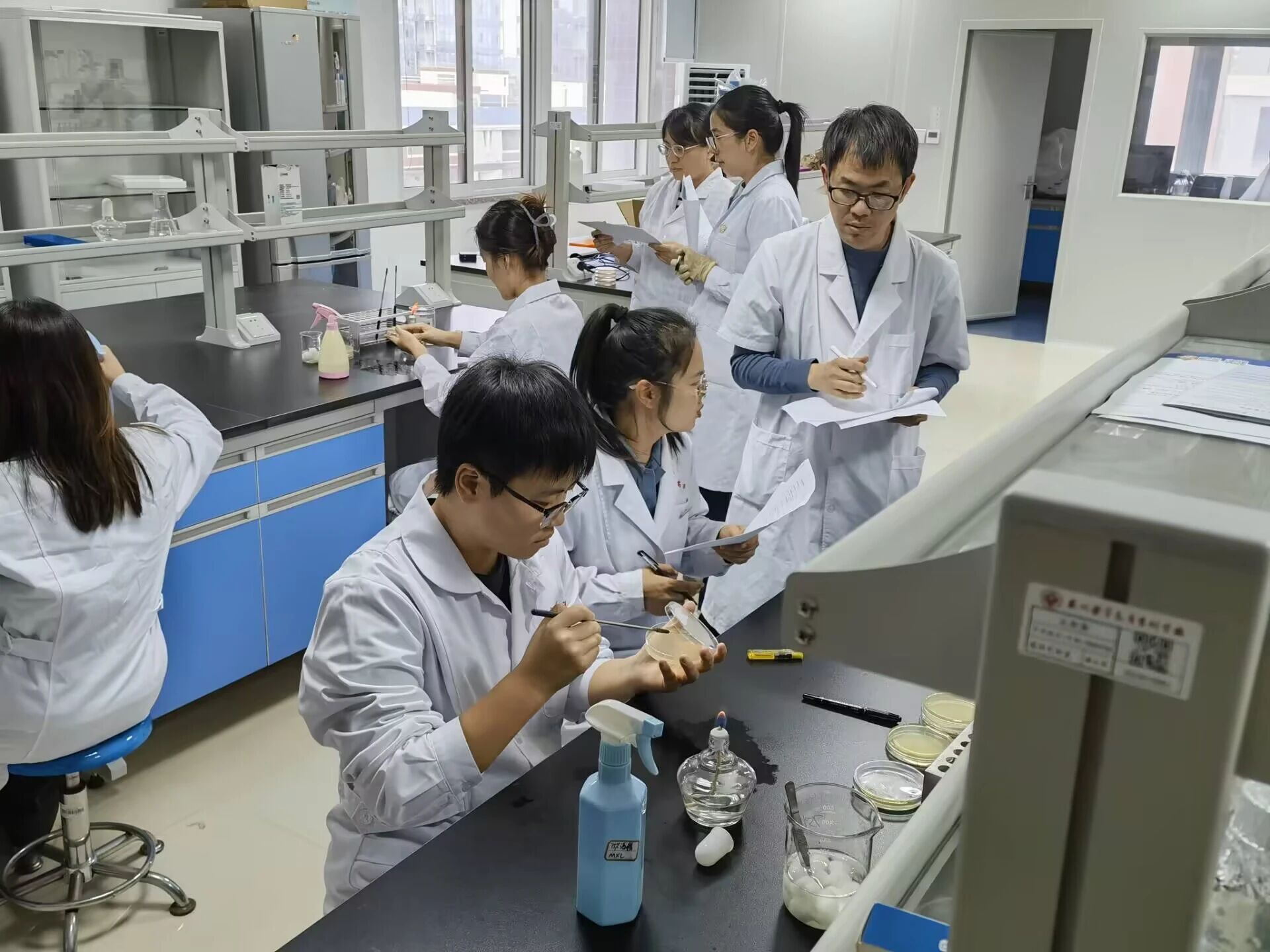 活动前期,实验室团队完成了培养基配制、培养皿灭菌、实验器材校准等筹备工作,确保实验条件符合无菌要求。活动现场,指导老师先系统讲解平板划线法的原理、单一菌落形成的科学依据及实验安全注意事项,随后通过全程示范,重点演示接种环灭菌冷却、分区划线手法、火焰周围无菌操作等关键步骤,强调逐步稀释、避免污染、精准划线的核心原则。