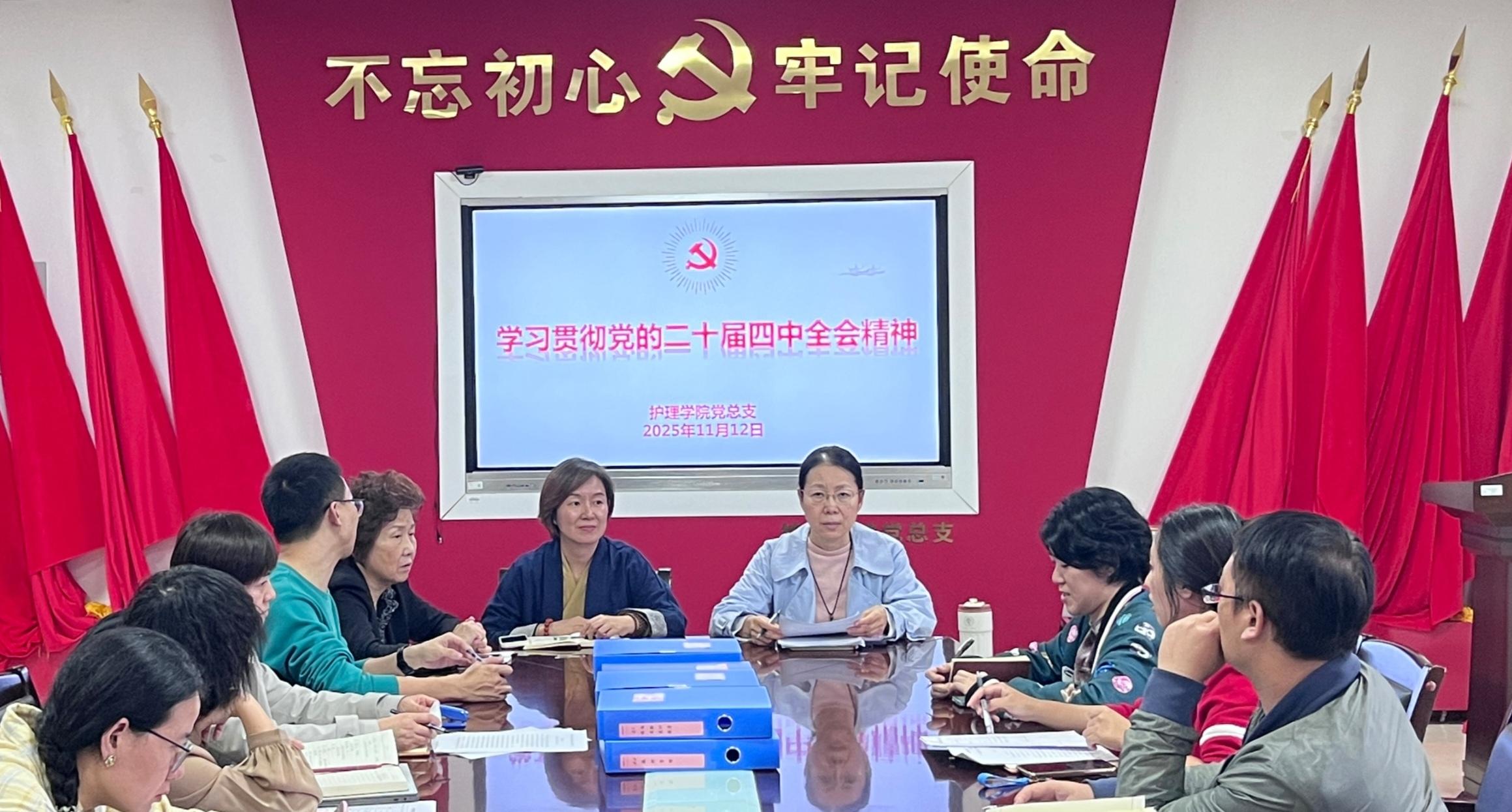 11月12日下午,护理学院党总支在南附属楼308室组织召开学习贯彻党的二十届四中全会精神会议。会议由党总支书记洪迎迎主持,党总支、教工及学生党支部委员,学院分工会主席、教务科、学生科长参会。