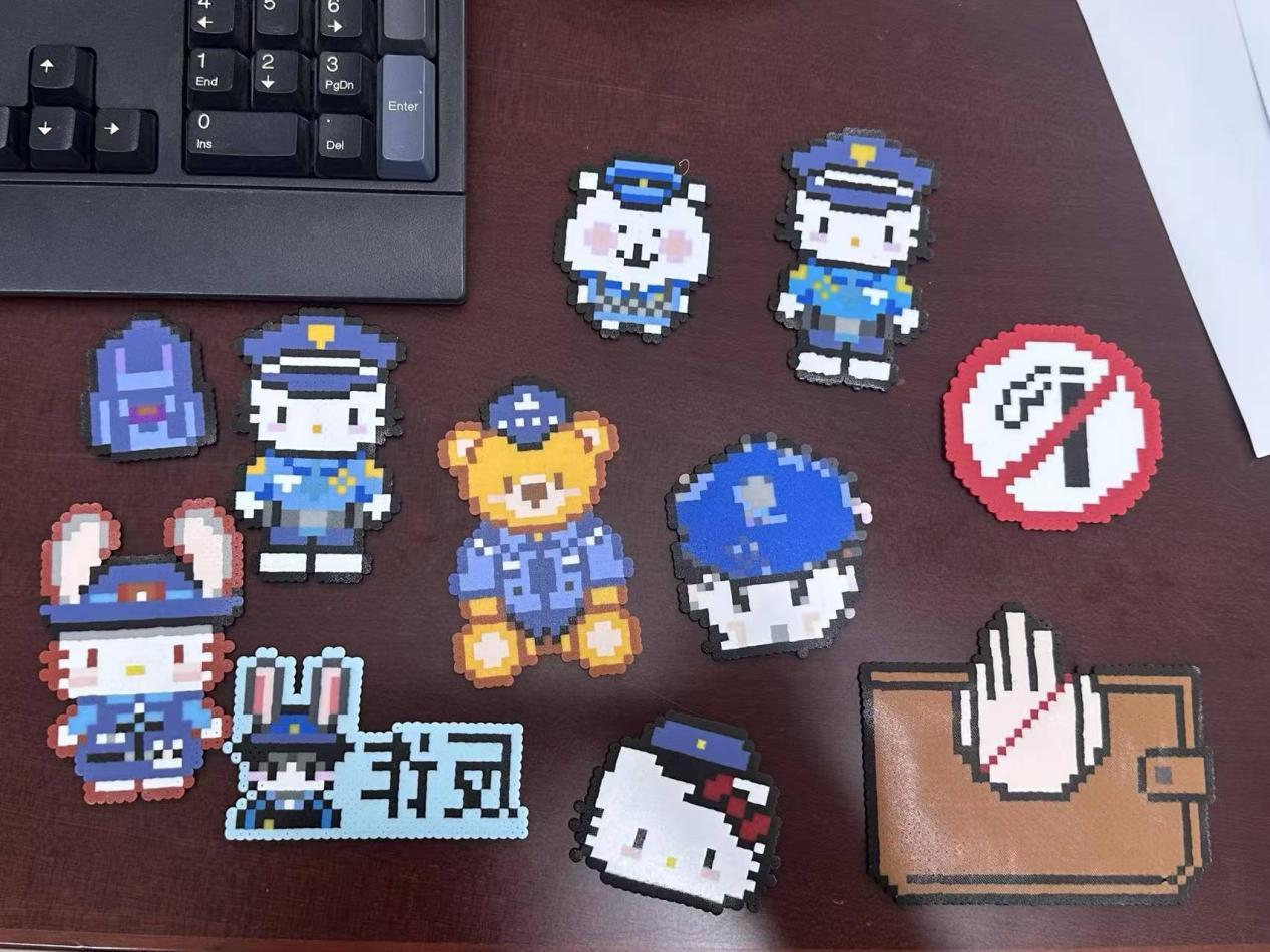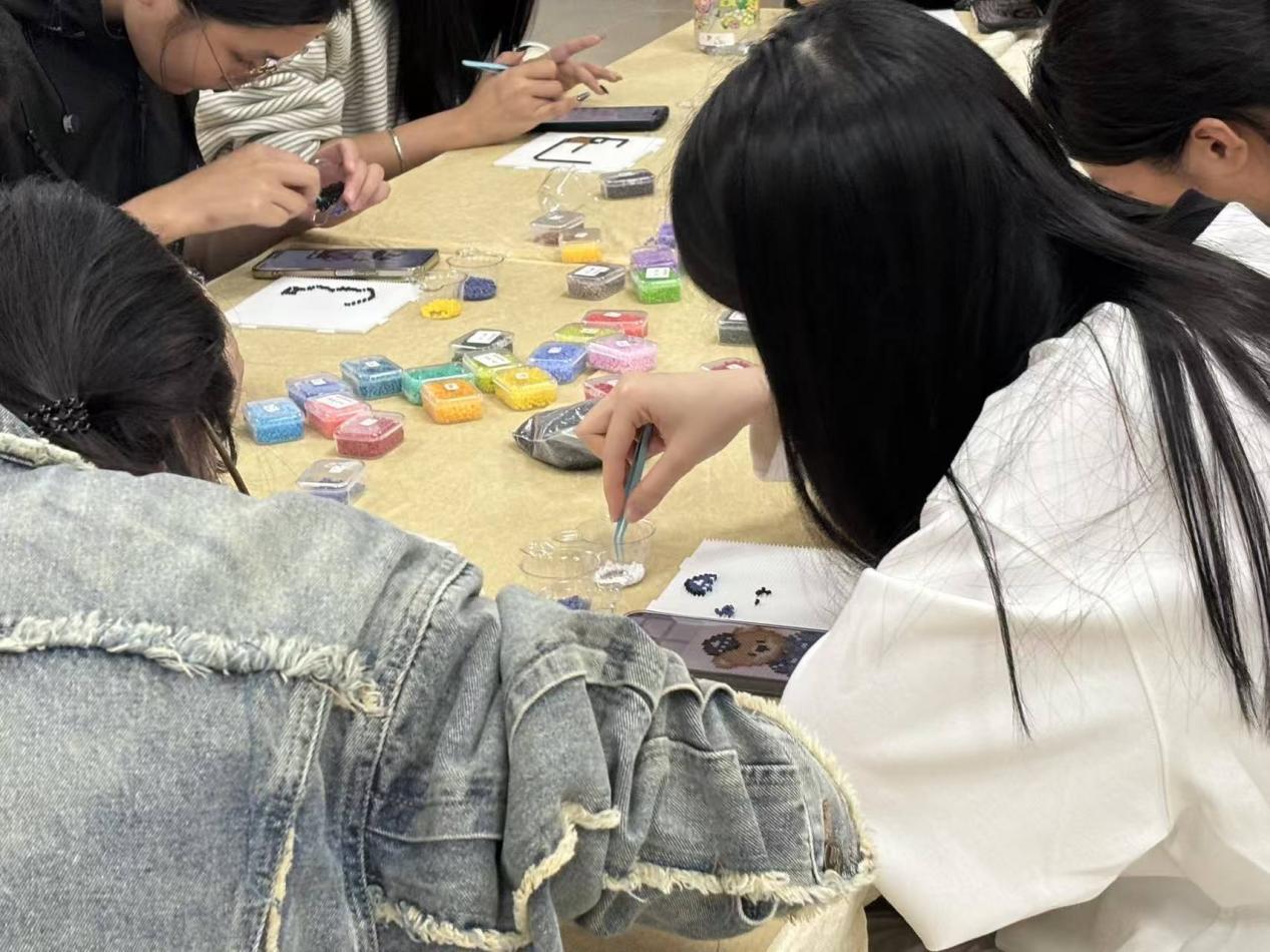 活动现场暖意融融,同学们签到落座后,领取拼豆的创作材料包。在主持人讲解活动规则后大家投入创作:有的以“不听不信不转账”为核心设计文字类作品,有的将盾牌等安全符号融入图案,有的则通过像素画可爱形象体现出常见反诈形象。大家在60分钟内完成了寓意鲜明的作品,由工作人员收集统一进行熨烫定型与编号登记。