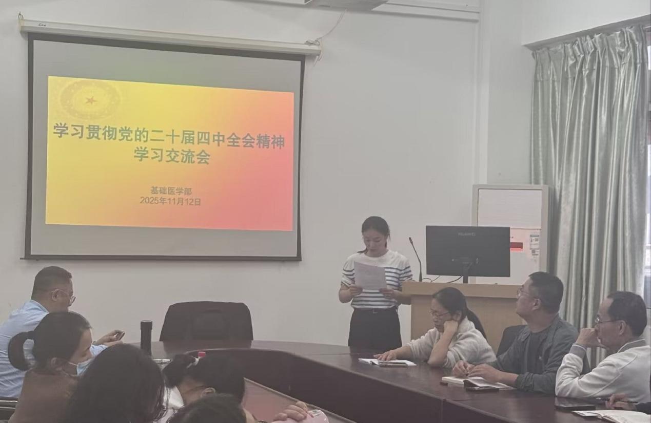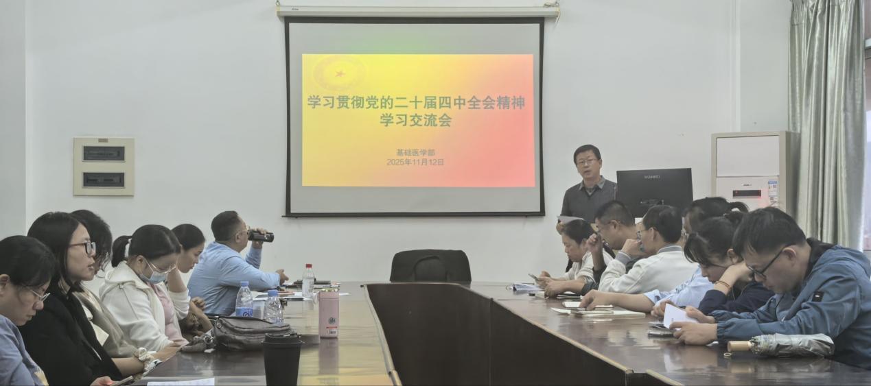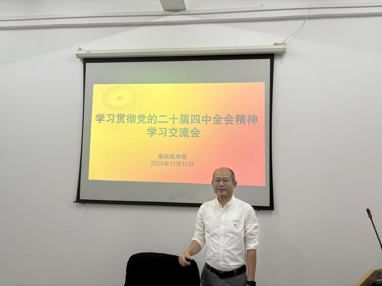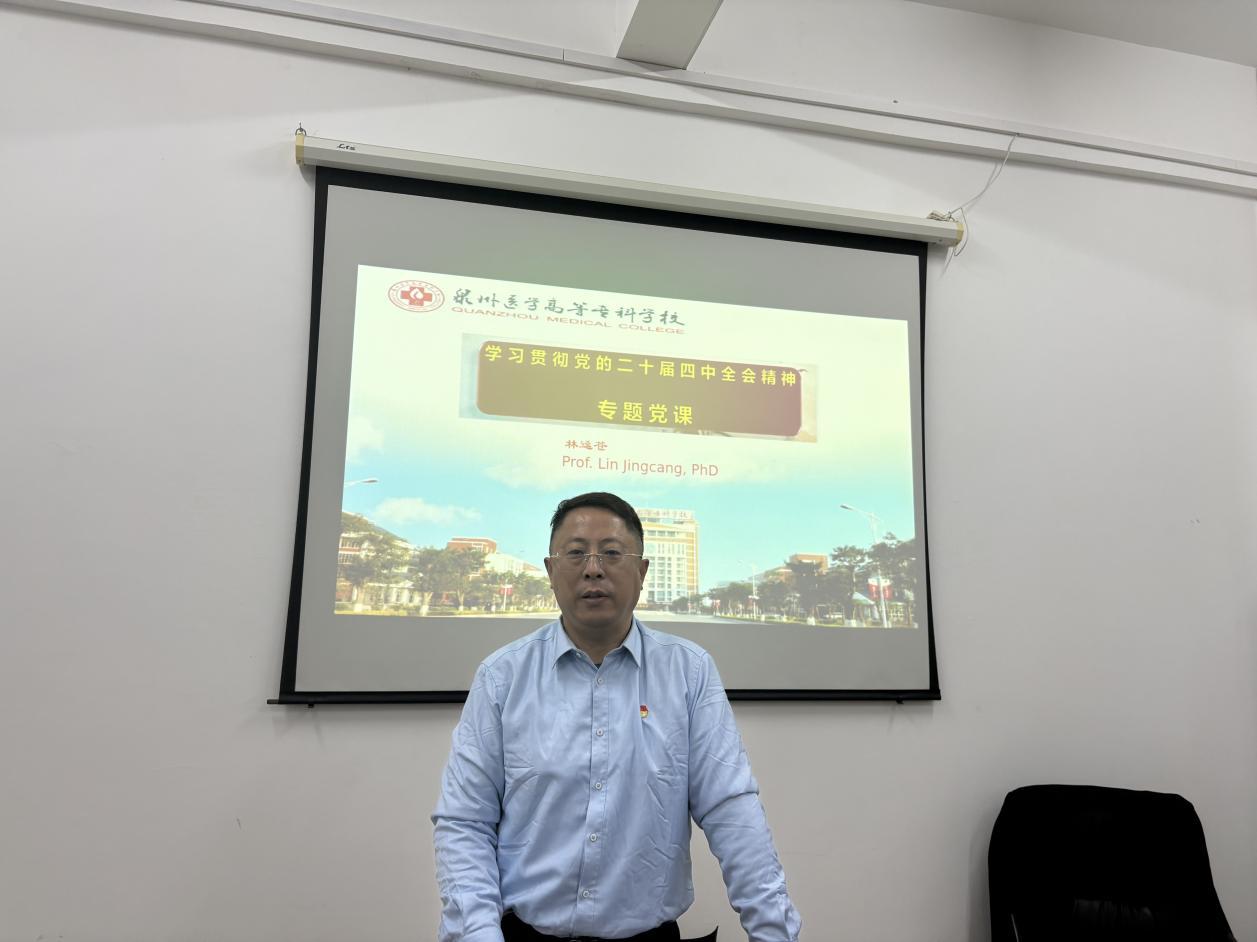 为学习宣传贯彻党的二十届四中全会精神,2025年11月12日下午,副校长、基础医学部党总支书记林迳苍在洛江校区基础医学部会议室为部门全体人员上了一堂生动的专题党课。