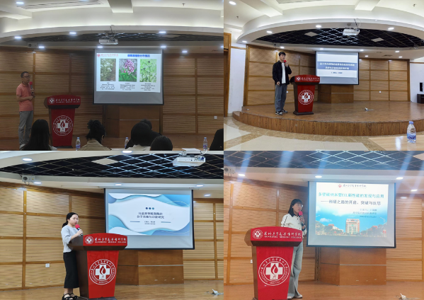 在随后的博士论坛交流环节,4位不同学科的博士先后登台,分享了他们的最新研究进展与科研心得。吴军凯博士以《植物药黑水缬草的生药学研究》为题,带领大家领略了传统中药的现代研究魅力。许晓文博士汇报的《基于荧光增强的新型纳米结构有机框架传感器选择性灵敏检测多西环素》,展示了前沿材料在药物检测领域的精密应用。黄玉香博士则从分子层面深入解读了《马蓝莽草酸激酶的分子克隆与功能研究》,为药效物质生物合成提供了新见解。最后,王瑞娜博士以《多壁碳纳米管ECL新性能的发现与应用》为主线,声情并茂地分享了其科研道路上从开启、突破到反思的心路历程。四位博士的智慧分享和科学精神赢得了现场阵阵掌声。
