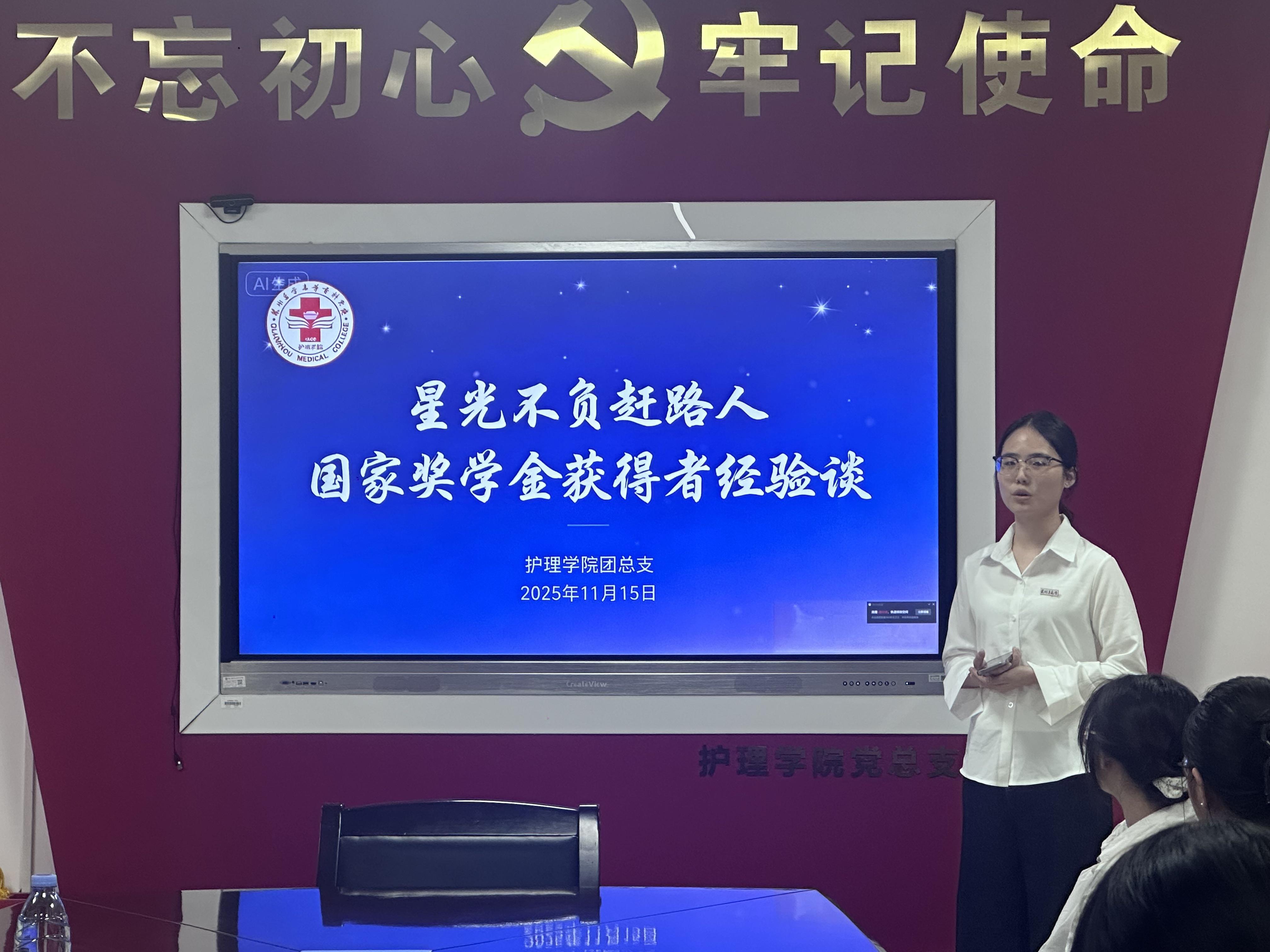 为发挥榜样引领作用,激励广大学子勤奋学习、积极进取,11月15日晚,护理学院团总支举办的“星光不负赶路人——国家奖学金获得者经验谈”分享会在南附属308教室进行。分享会特邀2025年国家奖学金获得者、2023级老年保健与管理班许慧琳同学主讲。许慧琳同学在校期间表现优异,不仅荣获国家奖学金,还获得了省技能竞赛三等奖、泉州市优秀团员、校一等奖学金及校三好学生等诸多荣誉。