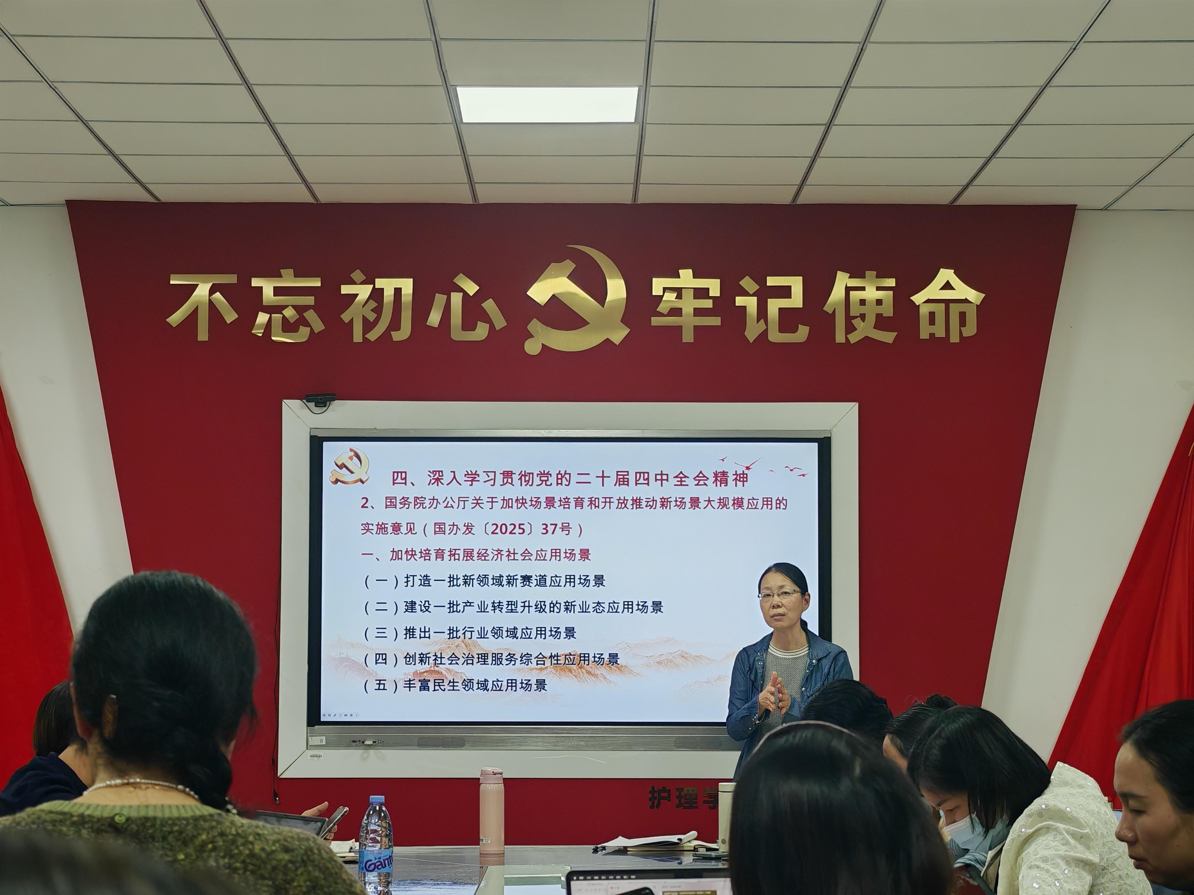 11月24日下午,护理学院党总支书记洪迎迎在南附属楼308室为全体教师讲授《深入学习贯彻党的二十届四中全会精神》专题党课。