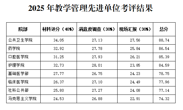 根据《泉州医学高等专科学校“3+1”专项行动总方案》(泉医专委〔2025〕26号)“2025年教学能力提升专项行动方案”工作部署,学校聘请校外评审专家从材料审核、满意度调查和现场汇报三部分开展教学管理先进单位考评工作,各部分评分分别占总分的40%、30%和30%。现将最终结果进行公示,公示期为2025年12月8日—12月12日。若有异议,请于公示期内书面提交有关材料。