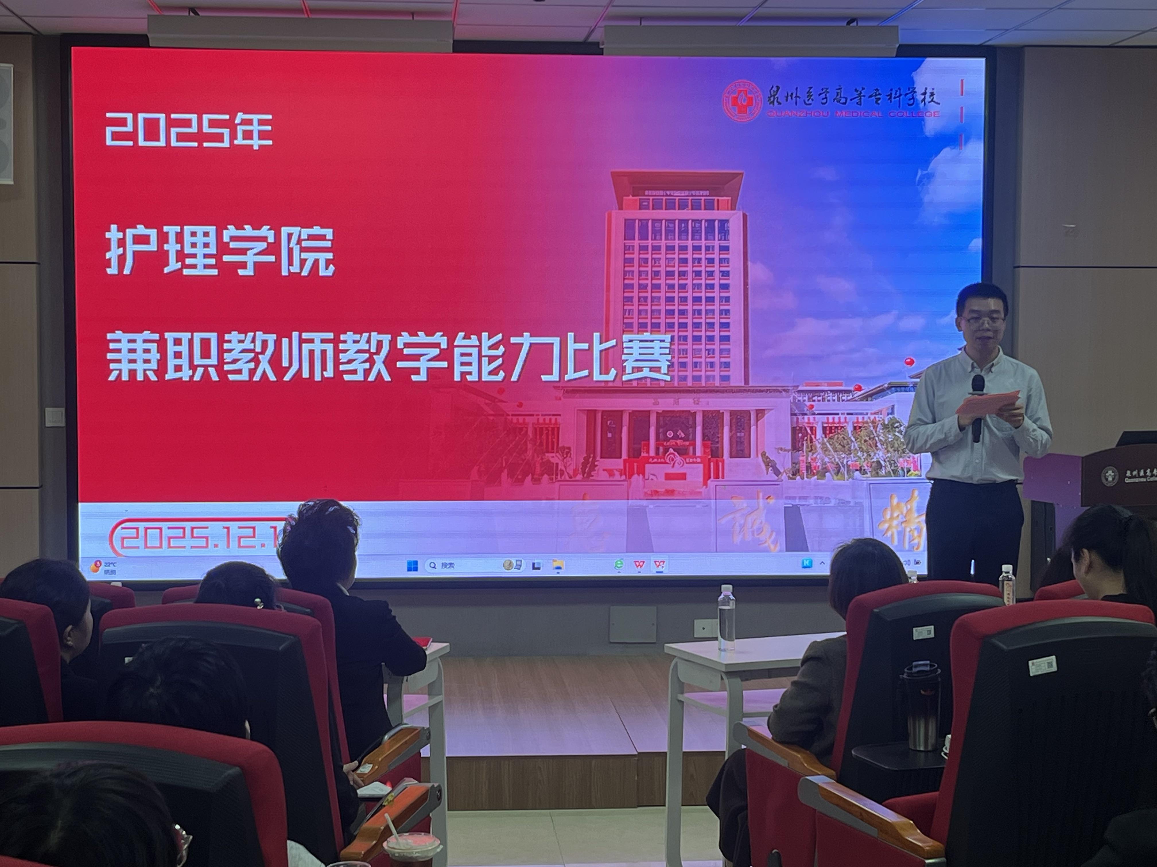 2025年12月10日下午,护理学院在南楼附属楼208举办2025年护理学院兼职教师教学能力比赛。本次比赛邀请泉州医学高等专科学校教务处殷知越科长、陈娇科长、护理学院李辉教授、基础护理教研室主任陈细曲副教授及内科护理教研室主任陈芬菲副教授担任现场评委,活动由教务科杨士来科长主持,党总支书记洪迎迎、副院长(主持工作)彭金出席本次活动。