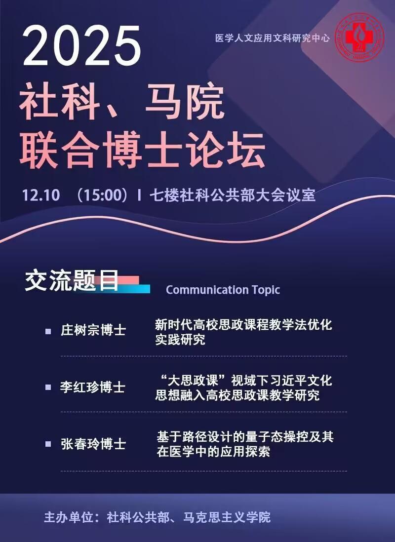 为促进学术交流,拓宽研究视野,推动学科交叉融合,进一步提升教师的科研能力与理论素养,2025年12月10日下午,社科公共部与马克思主义学院在图书信息中心七楼社科公共部会议室联合举办博士论坛。