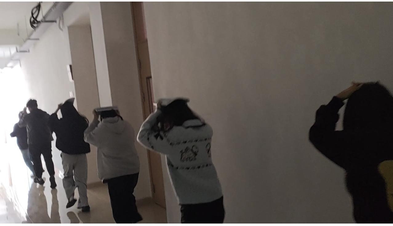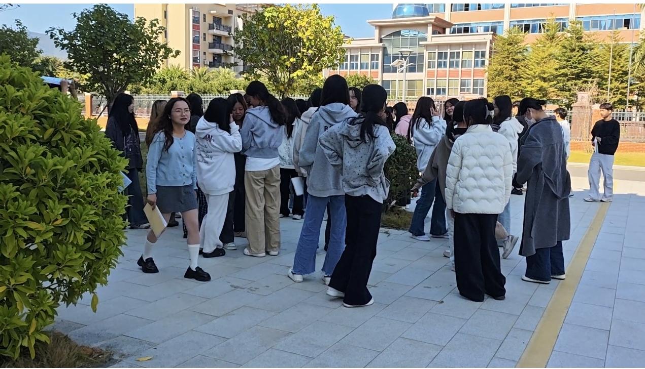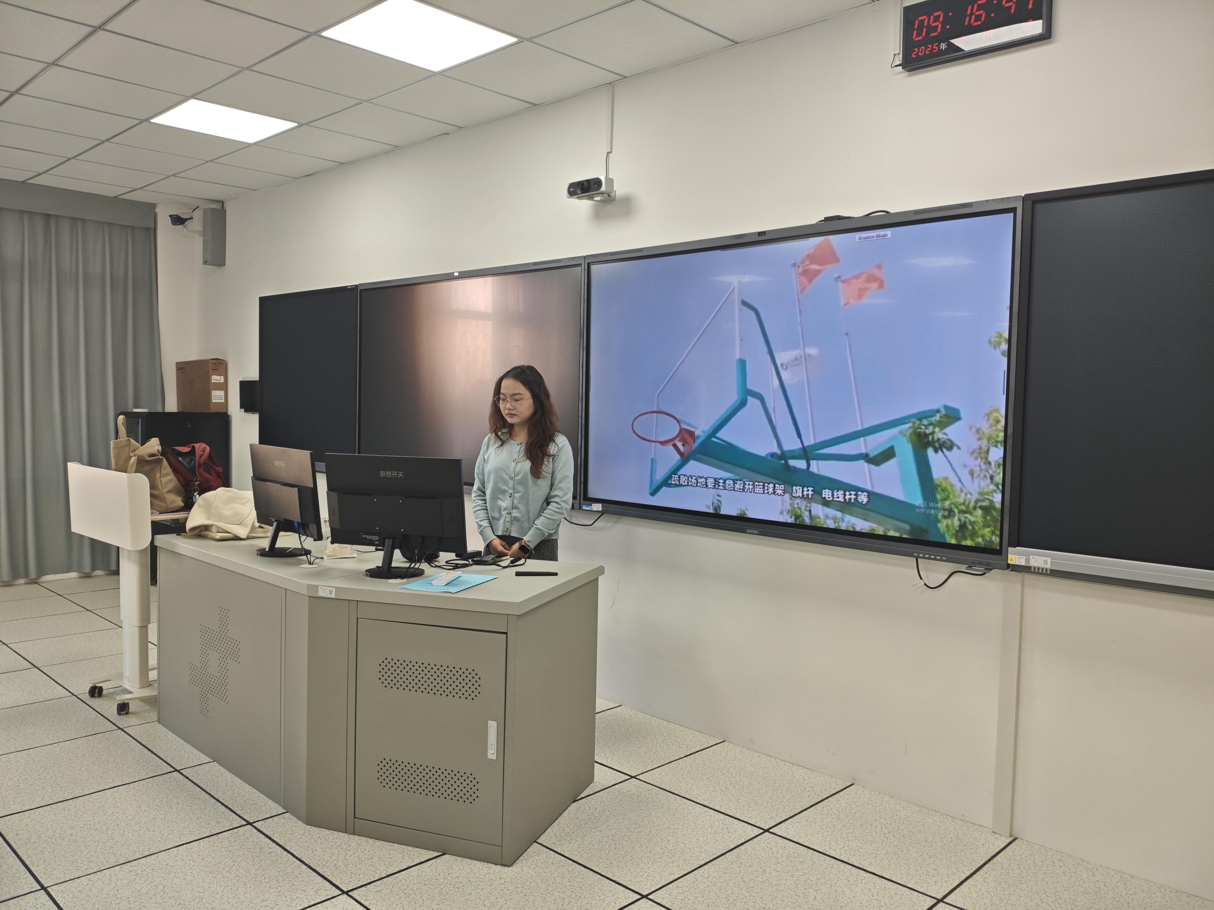 本次演练设定为求知楼2楼智慧语音室上课时间发生有感地震,语音室安全负责人施密娜老师就位,协助老师和同学们进行有顺撤离。