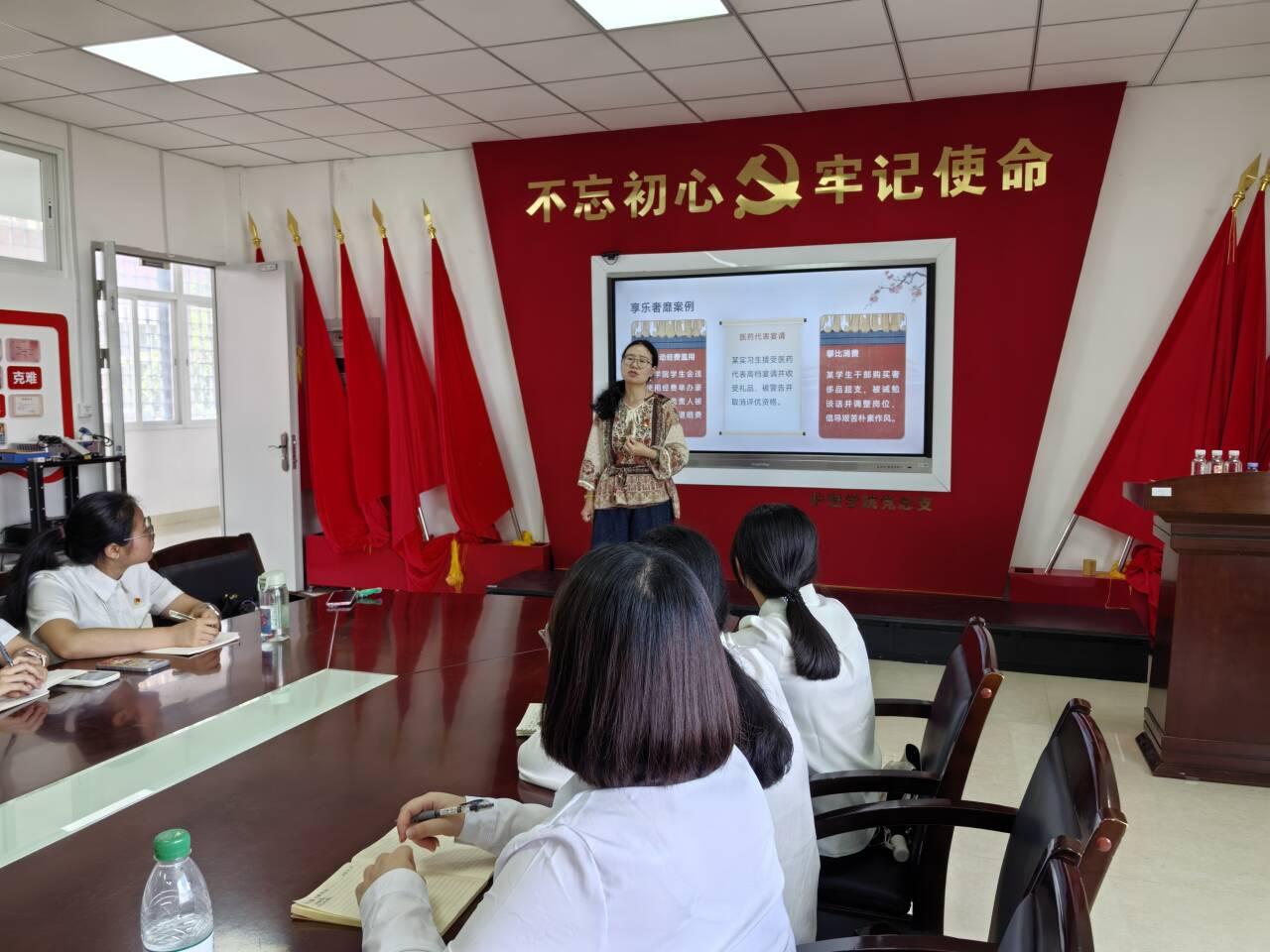 2025年6月26日,护理学院学生党支部书记在附属楼308室面向2025届毕业生党员,开展了一堂以“医心向廉·行稳致远——中央八项规定精神指引下的医学生成长之路”为主题的党课。