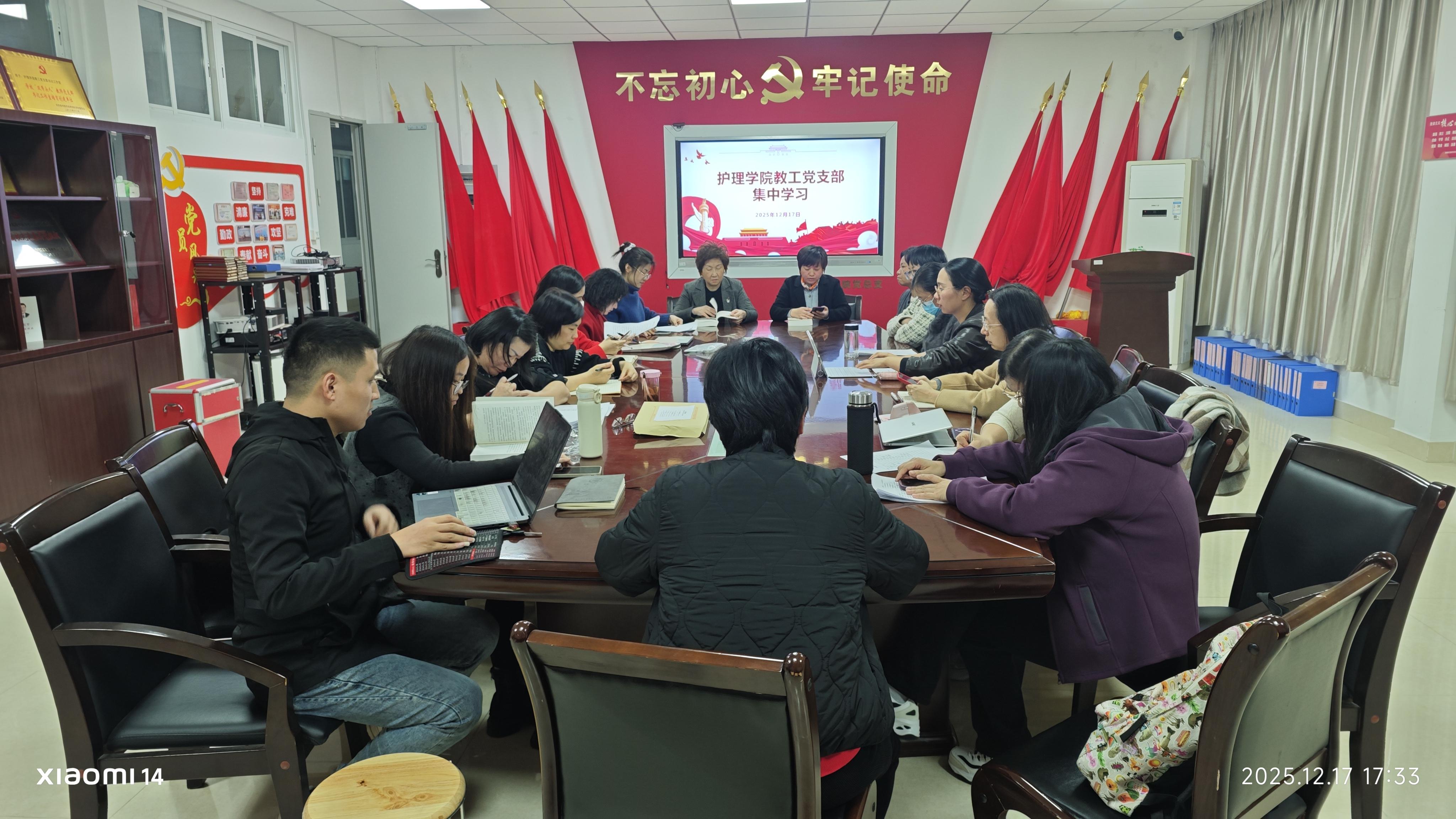 为深入学习贯彻习近平总书记近期重要讲话精神和中央、省、市重要会议精神,2025年12月17日,护理学院教工党支部召开全体党员集中学习会议。会议由党支部书记龚国梅主持,全体教师党员参加会议。