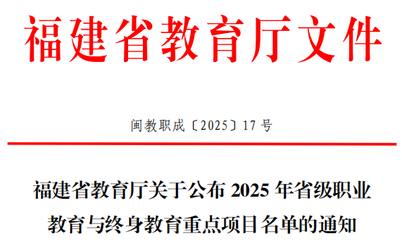 近日,福建省教育厅公布2025年省级职业教育与终身教育重点项目名单(闽教职成〔2025〕17 号),我院共有5个项目成功入选,涵盖2门课程思政示范课程、2门在线精品课程、1个虚拟仿真实训基地。