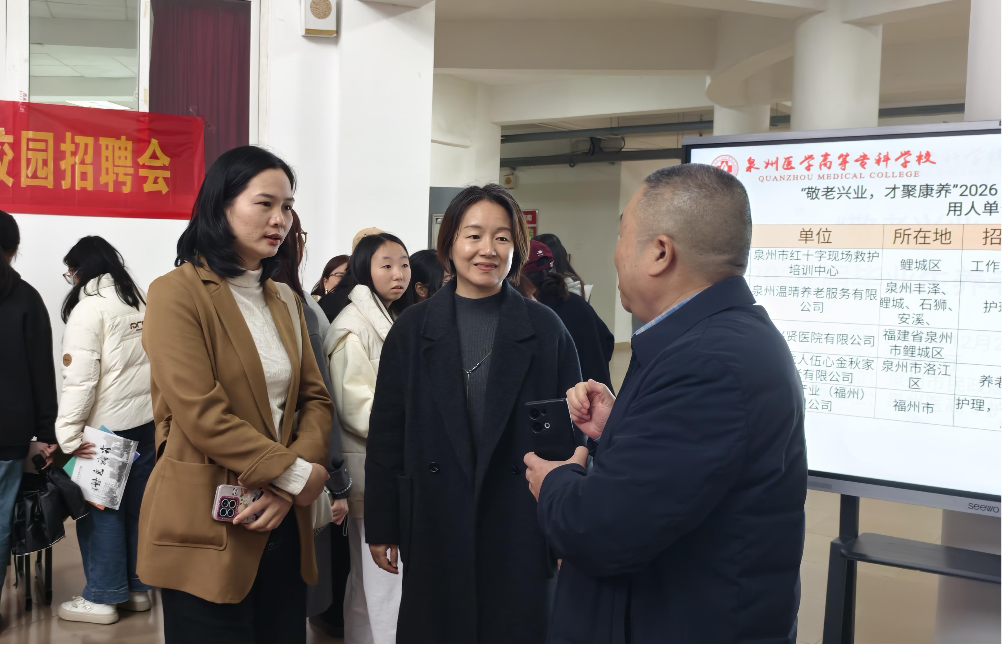 2025年12月25日,护理学院“敬老兴业,才聚康养”2026届毕业生校园招聘会在校内顺利举办。本次招聘会由泉州市民政局指导、学校护理学院、招生就业处联合主办,旨在搭建精准高效的供需对接平台,全力促进毕业生更加充分、更高质量就业。