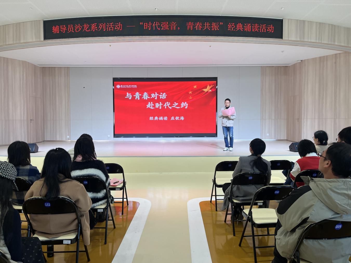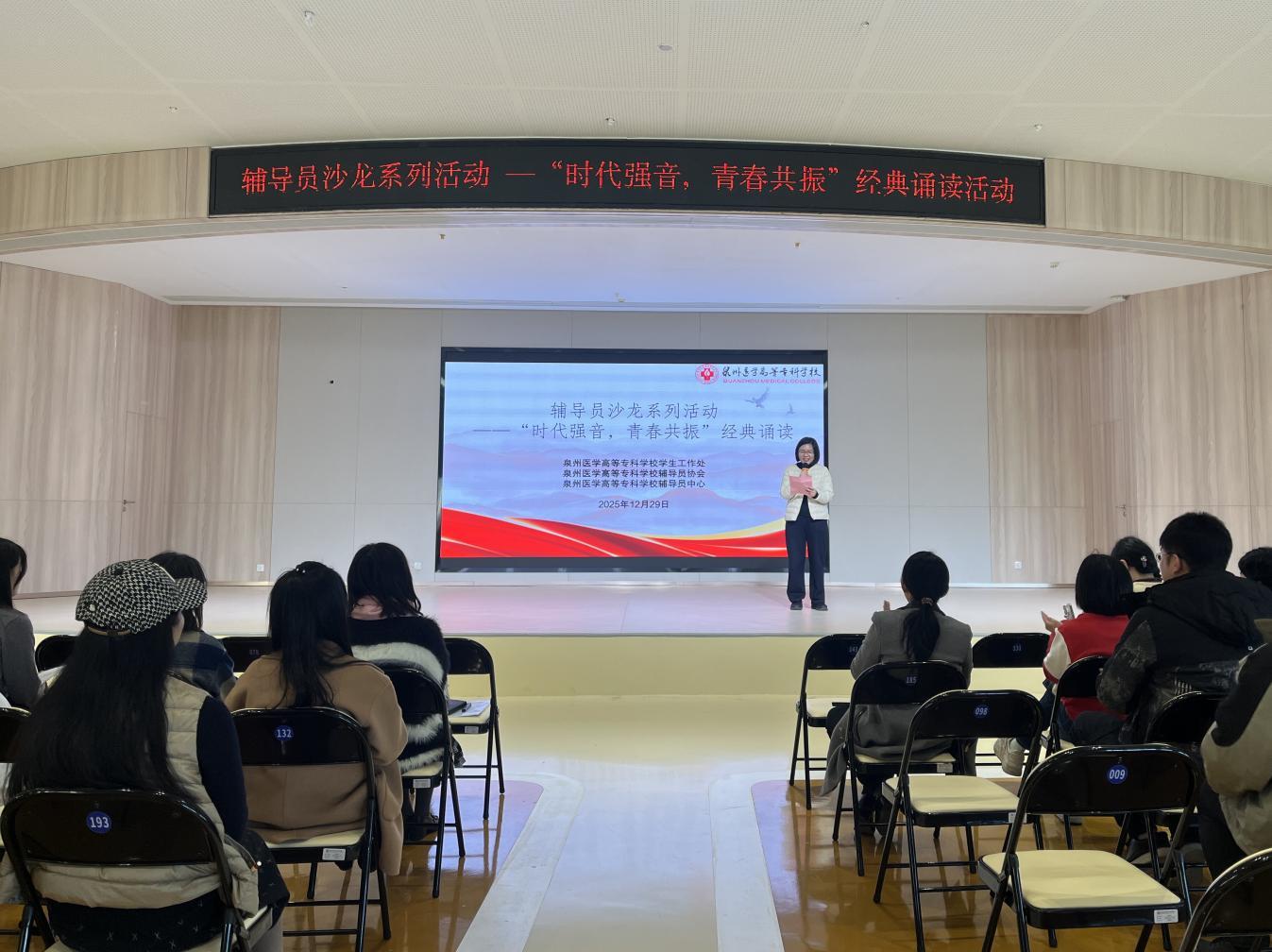 2025年12月29日下午,泉州医学高等专科学校在南安校区博艺文体中心三楼举行了2025年辅导员沙龙系列活动之“时代强音,青春共振”经典诵读活动。学工队伍的老师们参与了此次活动,活动由学生工作处副处长潘修娴主持。