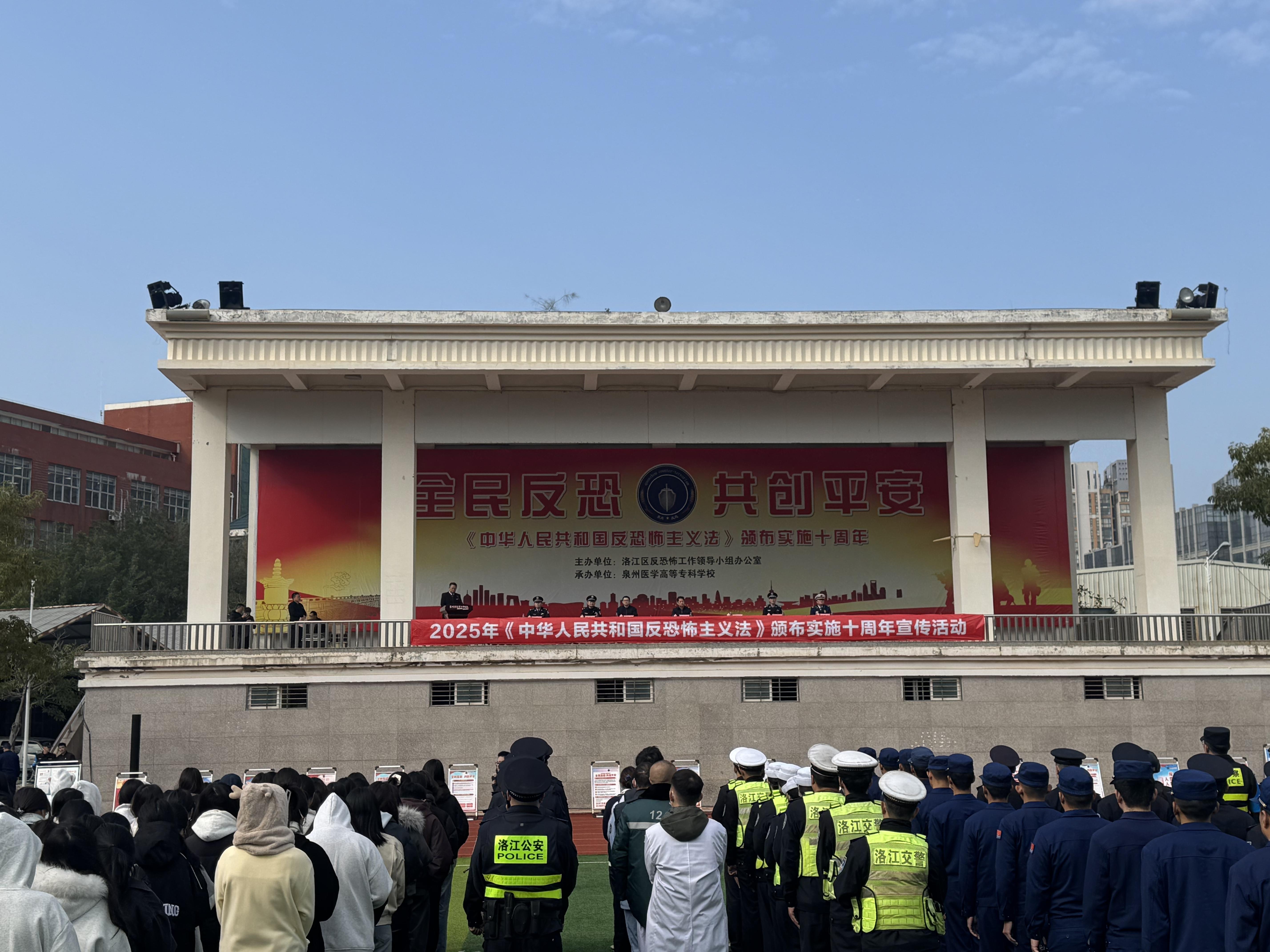 为深入贯彻总体国家安全观,切实提升全民识恐、防恐、反恐意识与能力,纪念《中华人民共和国反恐怖主义法》颁布实施10周年,12月26日上午,由洛江区反恐怖工作领导小组办公室主办、泉州医学高等专科学校承办的“全民反恐 共创平安”主题宣传教育活动在学校洛江校区运动场顺利举行。