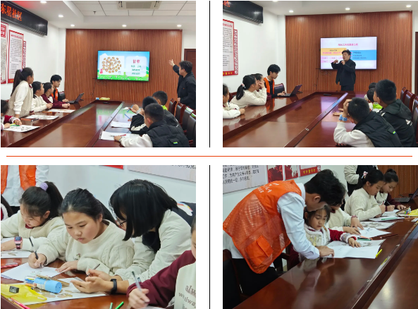 本次中医药文化系列主题活动面向该社区儿童开展,内容设计紧扣中医药文化与心理健康教育,分为四个环节有序推进。“药香暖冬”环节中,欧阳老师通过生动形象的PPT讲解山药小米粥、枸杞红枣粥等简易药膳的制作方法与养生功效,引导孩子们从饮食中感知中医智慧;“药香满园”标本展示,孩子们近距离观察中草药标本,聆听志愿者讲解药材来源与标本制作知识,在互动中激发对传统医药文化的兴趣;随后开展的“中药绘画大比拼”中,孩子们分组创作药用植物主题画作,在动手实践中深化对中医药的认知与情感联结;活动的最后,欧阳老师开展心理团辅小课堂,通过团队游戏增强孩子们的沟通协作能力,拓展社会支持网络,营造积极健康的成长氛围。