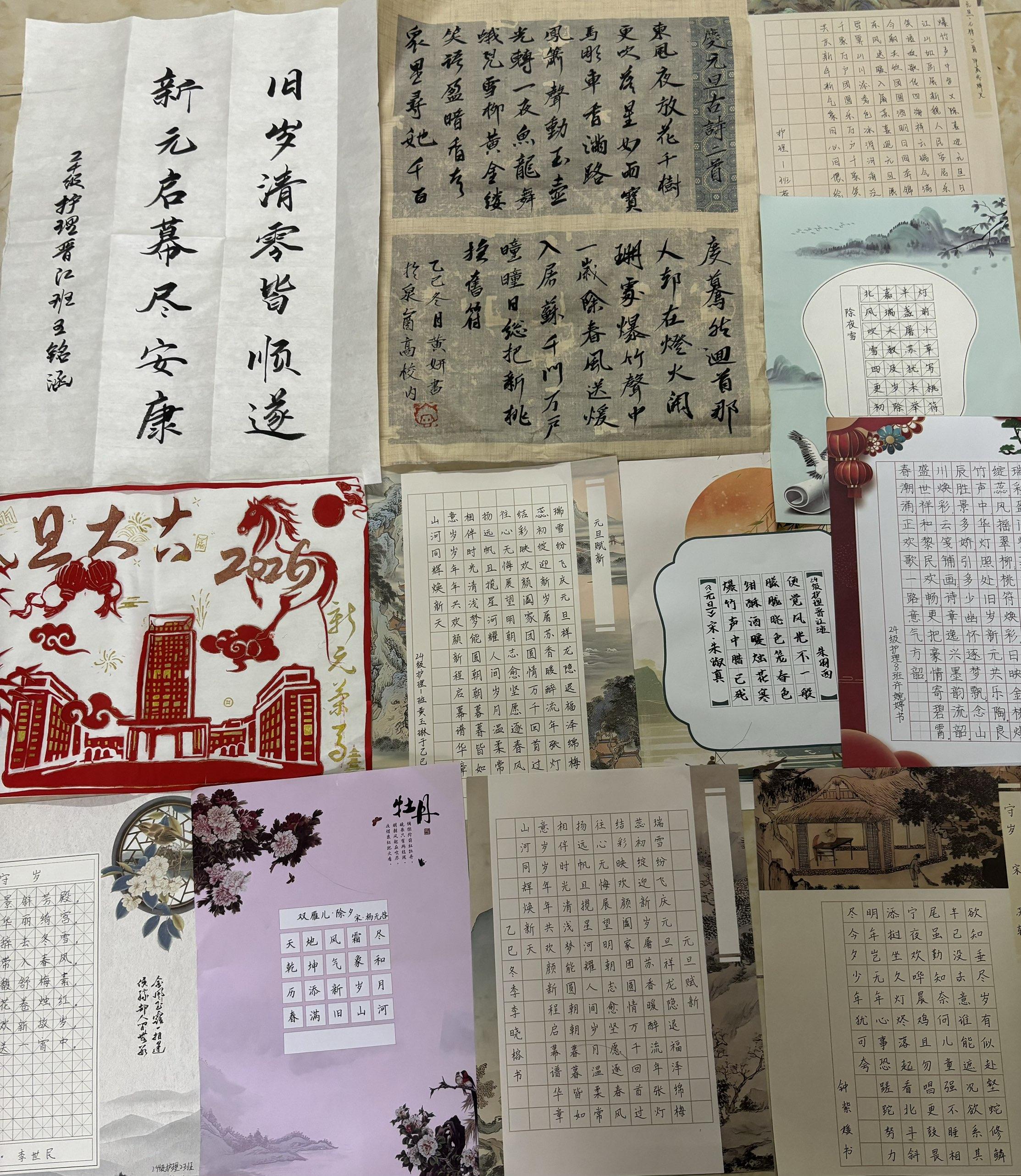 活动一经启动,便吸引了护理学院学子的踊跃参与。同学们执笔泼墨、匠心独运,参赛作品以书法、绘画的艺术形式呈现。它们巧妙融入剪纸、皮影、戏曲等非遗元素的独特神韵,与元旦新春的喜庆氛围相得益彰,展现了护理学子对传统文化的深刻领悟与当代创新,更传递出大家对新年的美好祝愿。评委团从艺术构思、非遗融合、技巧表现等多个维度进行综合评定,最终遴选出多项优秀作品并予以表彰。