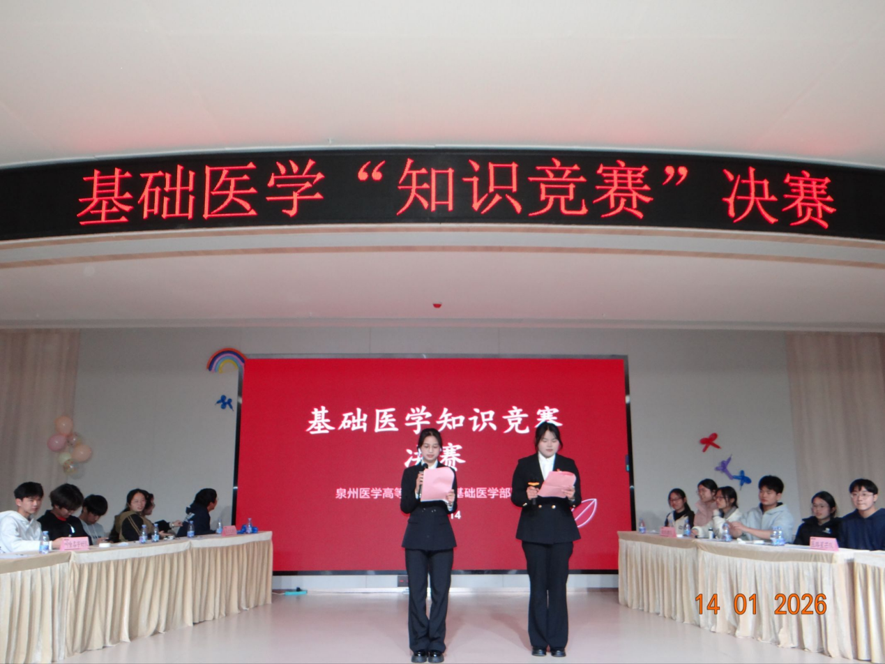 为夯实学生基础医学理论功底,营造比学赶超的浓厚学术氛围,基础医学部于2026年1月14日成功举办基础医学知识竞赛决赛。本次竞赛以“展医学风采,强专业素养”为主题,吸引了来自25级临床医学专业的6支队伍同台竞技。比赛邀请了基础医学部团总书记王姗姗、副书记郑良珺,生理学教研室黄倩副教授,病理学教研室魏攀凤老师担任评委。