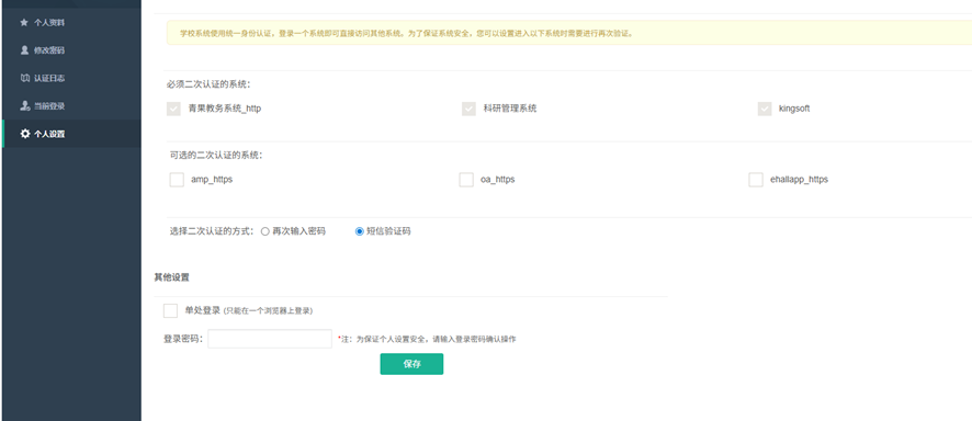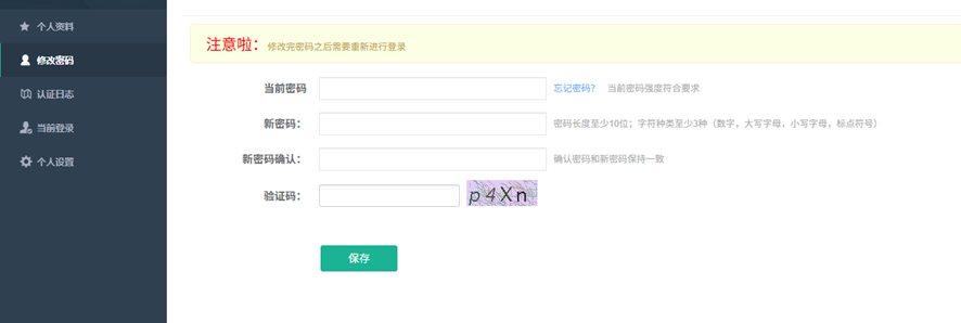 首次登录成功后,请立即进入右上角个人中心,修改初始密码为强度高的个人密码,个人中心还可以进行个人信息修改、二次认证方式修改等。