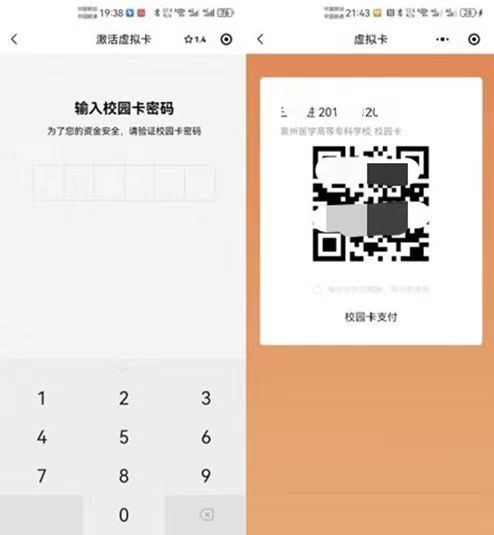 3.点击我的--虚拟卡,输入校园卡密码开通虚拟卡,显示二维码为开通成功,单日累计消费超 50 元时,需输入校园卡密码。查询密码则用于自助查询,自助挂失卡片等,查询密码可在小程序中修改。