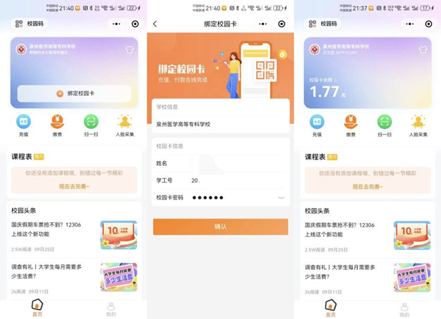 2.点击绑定校园卡,输入姓名、工号/学工号、校园卡密码。