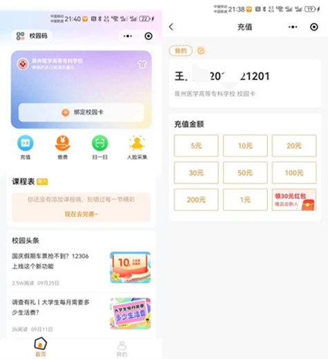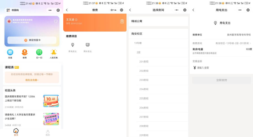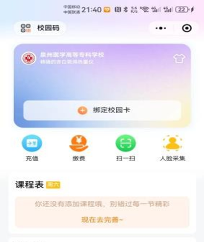 1.微信搜索完美校园小程序后,点击进入我的学校,选择学校-泉州医学高等专科学校。