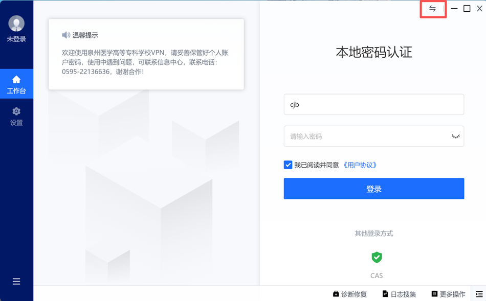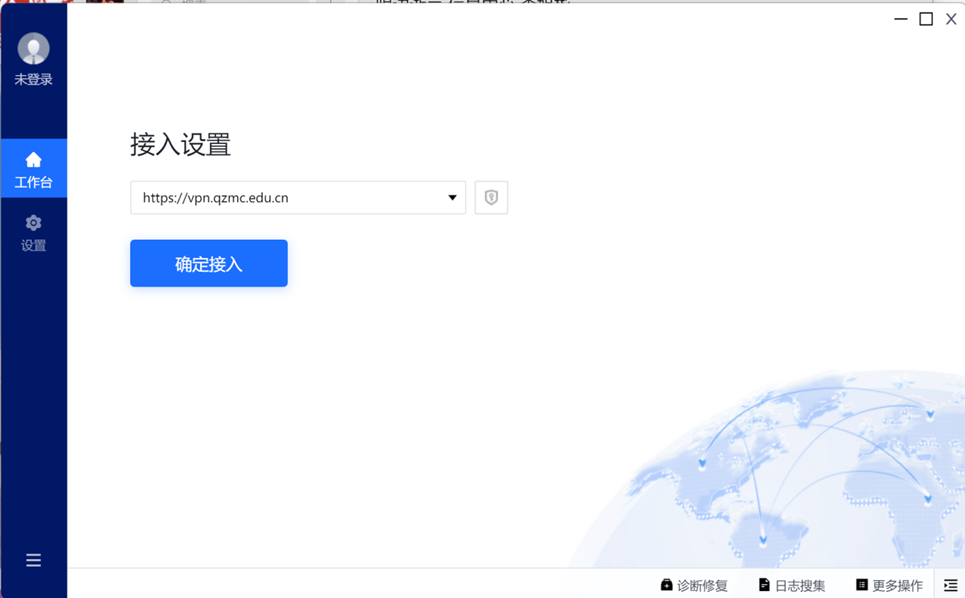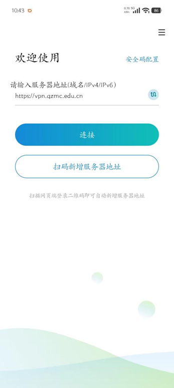 然后下载客户端、安装完成后打开客户端,点击右上角符号,输入域名:https://vpn.qzmc.edu.cn。