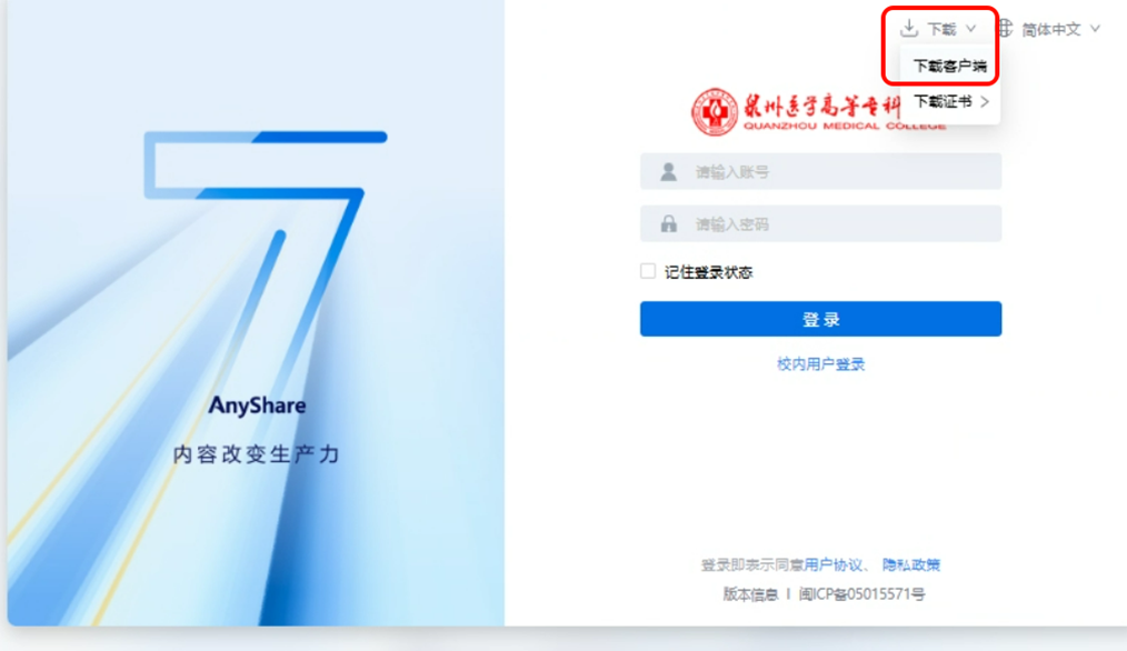 浏览器访问业务地址https://espace.qzmc.edu.cn,在登陆窗口右上方点击下载,如下图所示: