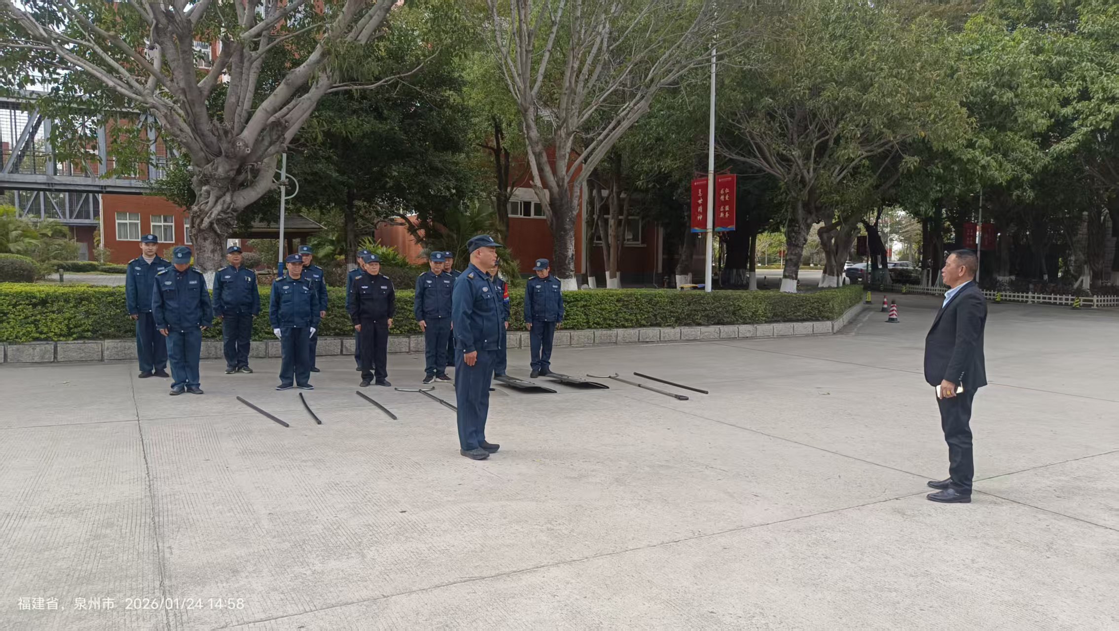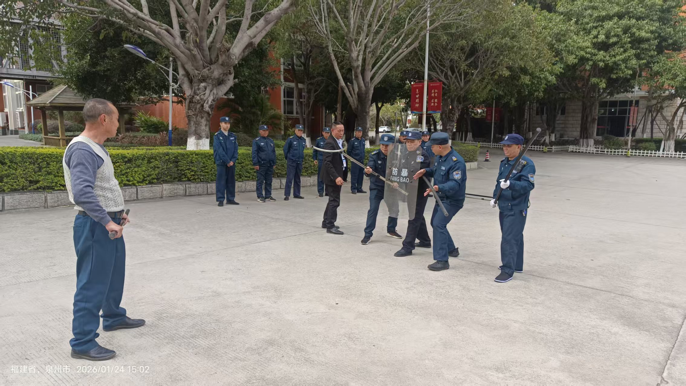 为进一步提升校园安保队伍的应急处突能力,筑牢校园安全防线,2026年1月24日下午,我校保卫处联合泉州纵横保安服务有限公司,在学校南门入口处组织开展保安常态化反恐防暴训练。泉州纵横保安服务有限公司王惠强经理、保卫处工作人员及全体安保队员参与了此次训练。
